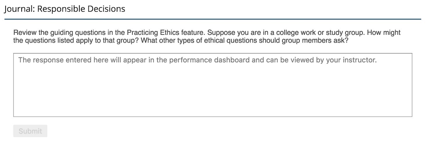 PracticingEthicssectionsareintegratedintoeachchapter.Tofurther drawattentiontotheimportanceofethics,manyofthesesectionsin RevelarepairedwithaJournalpromptorotherwritingexercise.