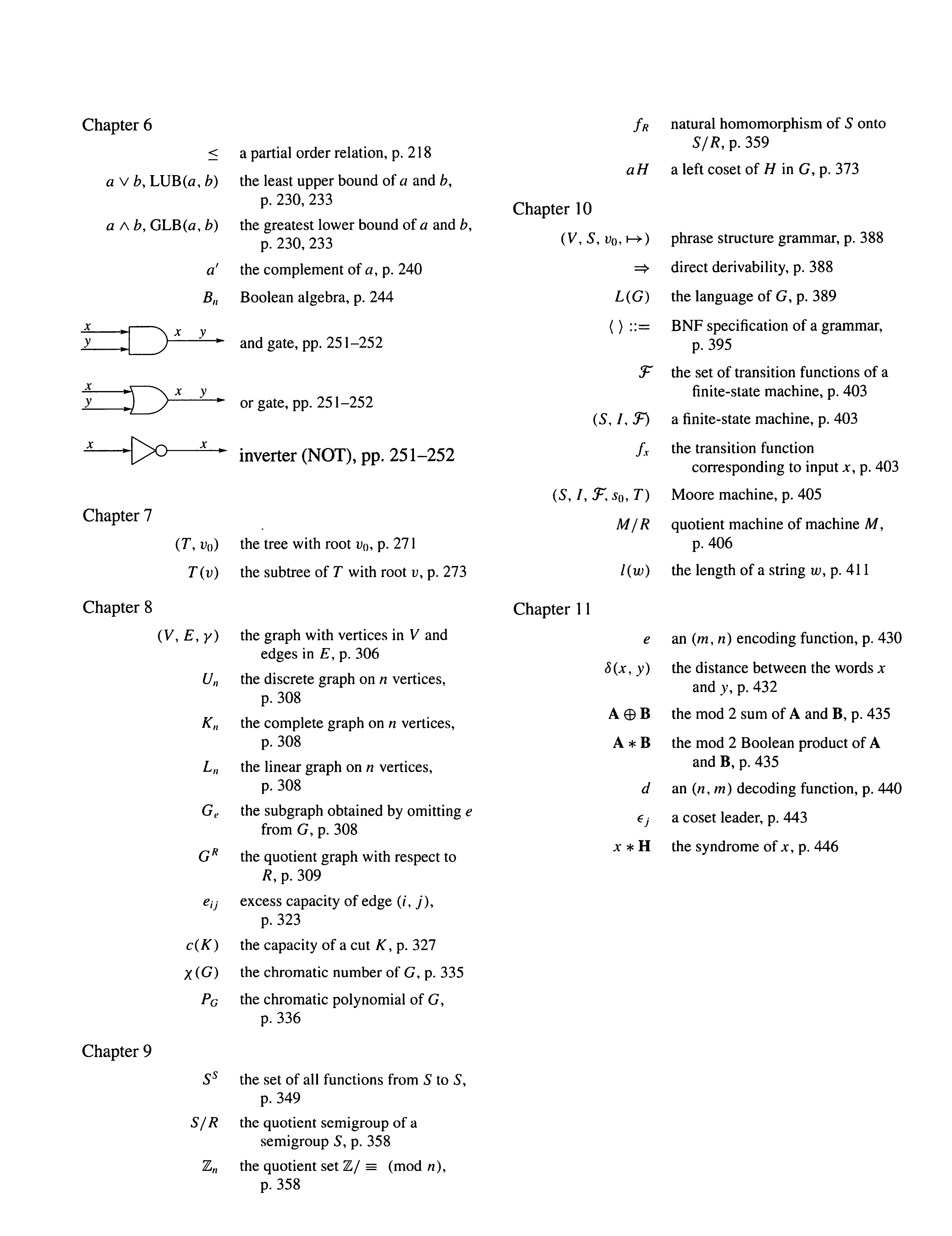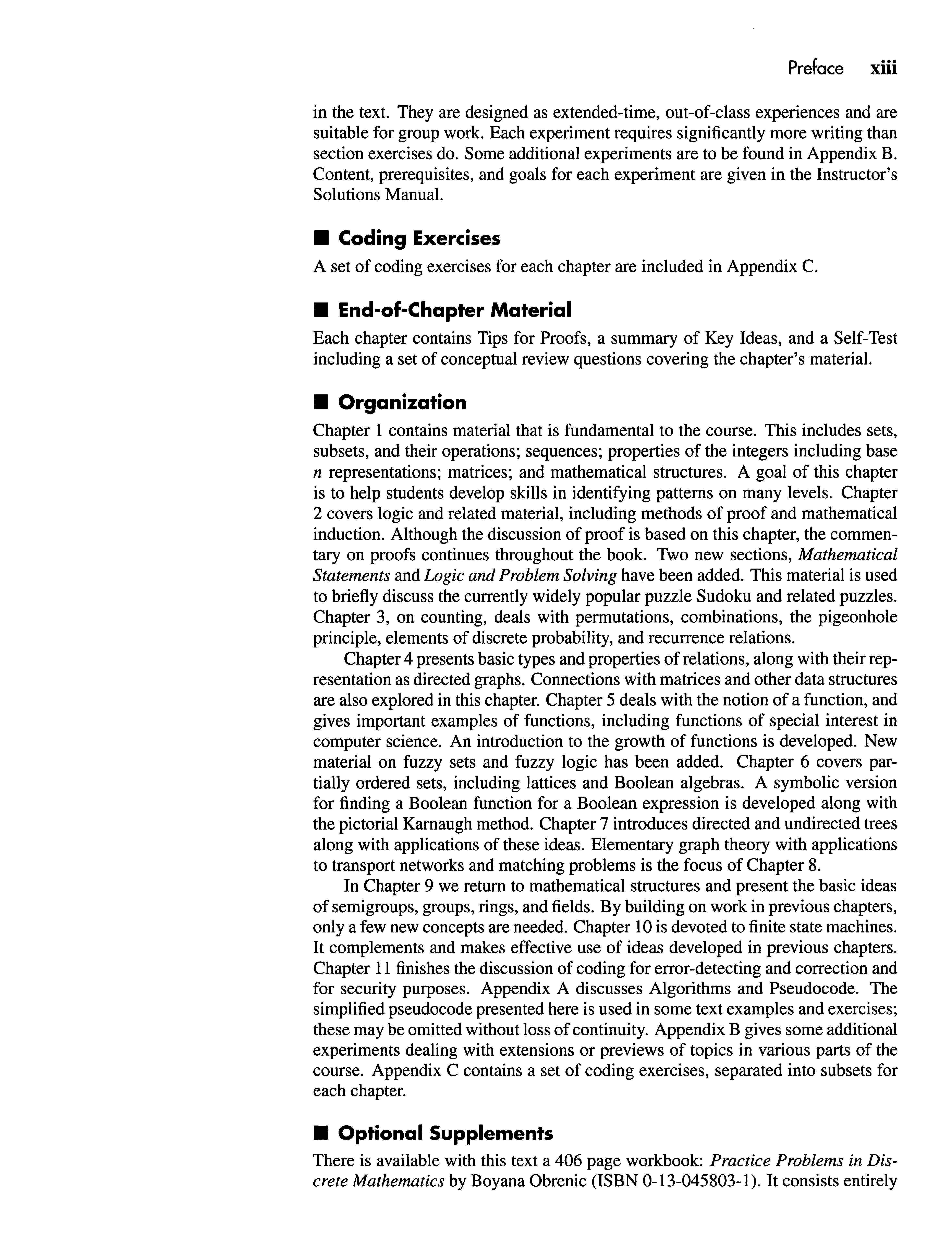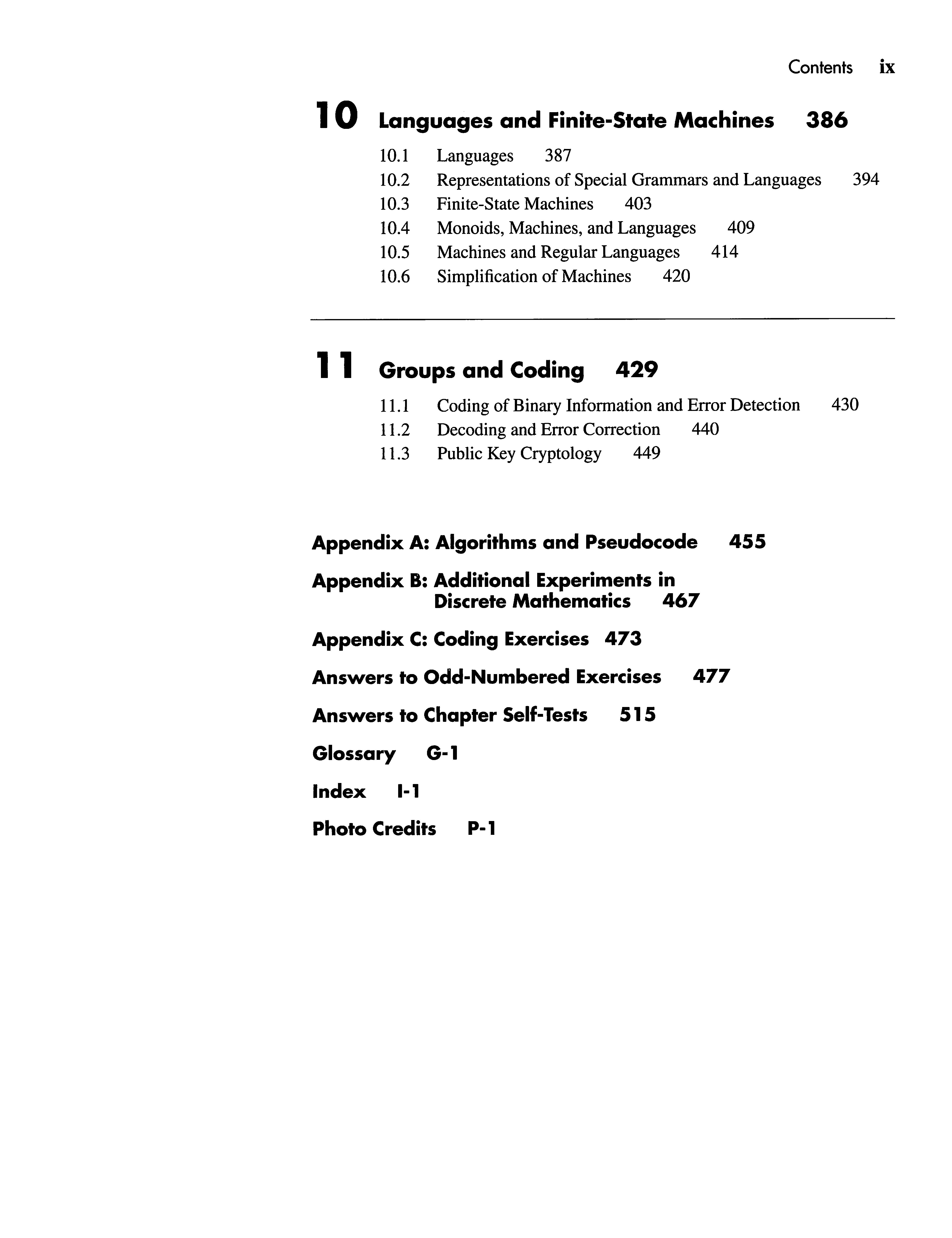 In Chapter 9wereturnto mathematical structures and present thebasicideas of semigroups, groups, rings,andfields.By building on work in previous chapters, onlyafewnew concepts are needed. Chapter 10 is devoted tofinitestate machines. It complements andmakes effective use of ideas developed in previous chapters. Chapter 11 finishesthe discussion of coding for error-detecting and correction and for security purposes. Appendix A discusses Algorithms and Pseudocode. The simplified pseudocode presented hereisusedin some text examples and exercises; these maybe omitted without loss of continuity. Appendix B gives some additional experiments dealing with extensions or previews of topics in various parts of the course. Appendix C contains aset of coding exercises, separated into subsets for each chapter.
