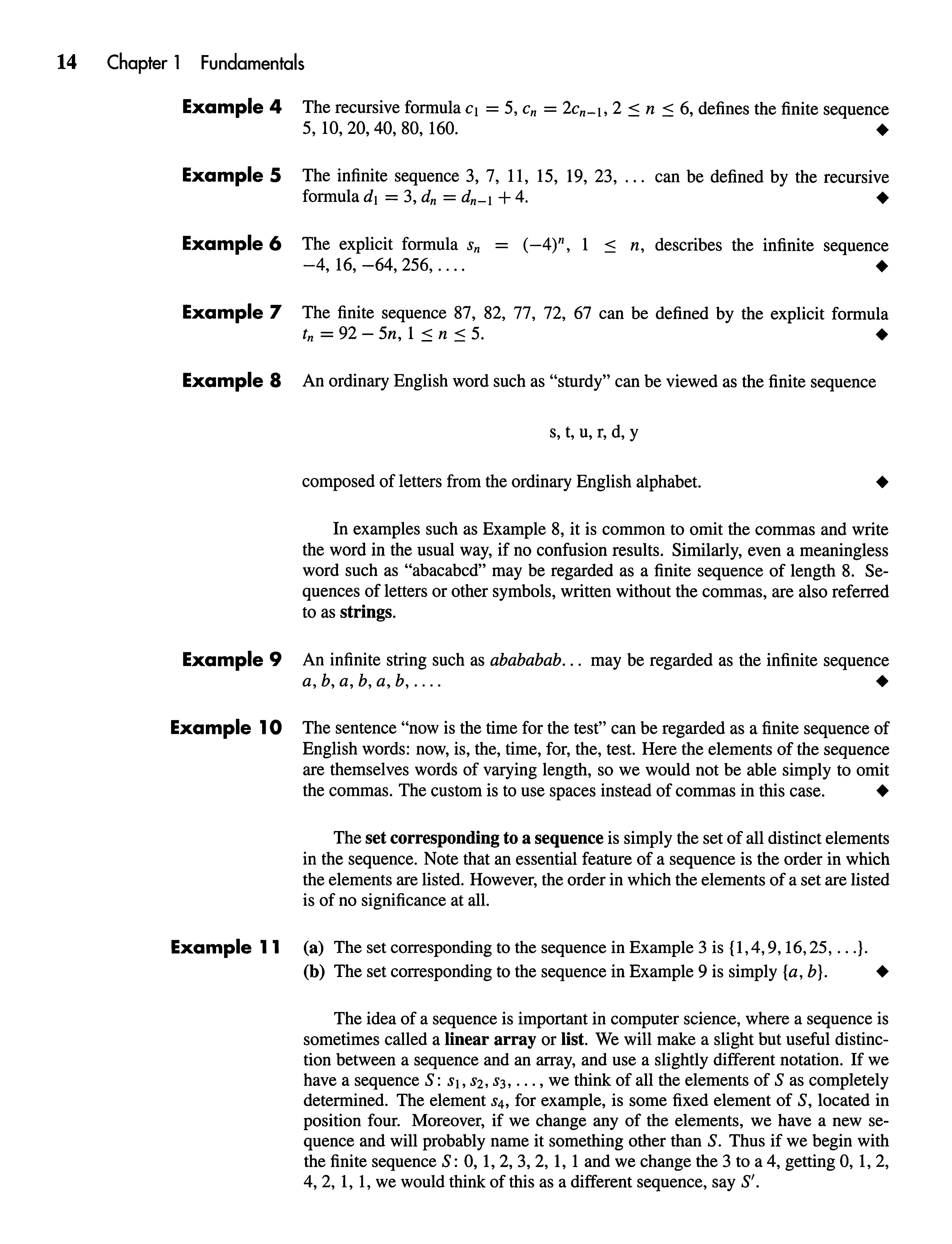 The idea of a sequence is important in computer science, where a sequence is sometimes called a linear array orlist.Wewill make a slight but useful distinc tion between a sequence andanarray,andusea slightly different notation. If we havea sequence S: s\, S2, S3,..., we think of allthe elements of 5as completely determined. The element 54, for example, is some fixed element of 5, located in position four. Moreover, if we change any of the elements, we have anewse quence andwill probably name it something other than S. Thus if we begin with thefinite sequence S: 0,1, 2,3,2,1,1andwe change the3toa4, getting 0, 1,2, 4,2,1,1,wewouldthinkofthisasadifferentsequence,say S'.