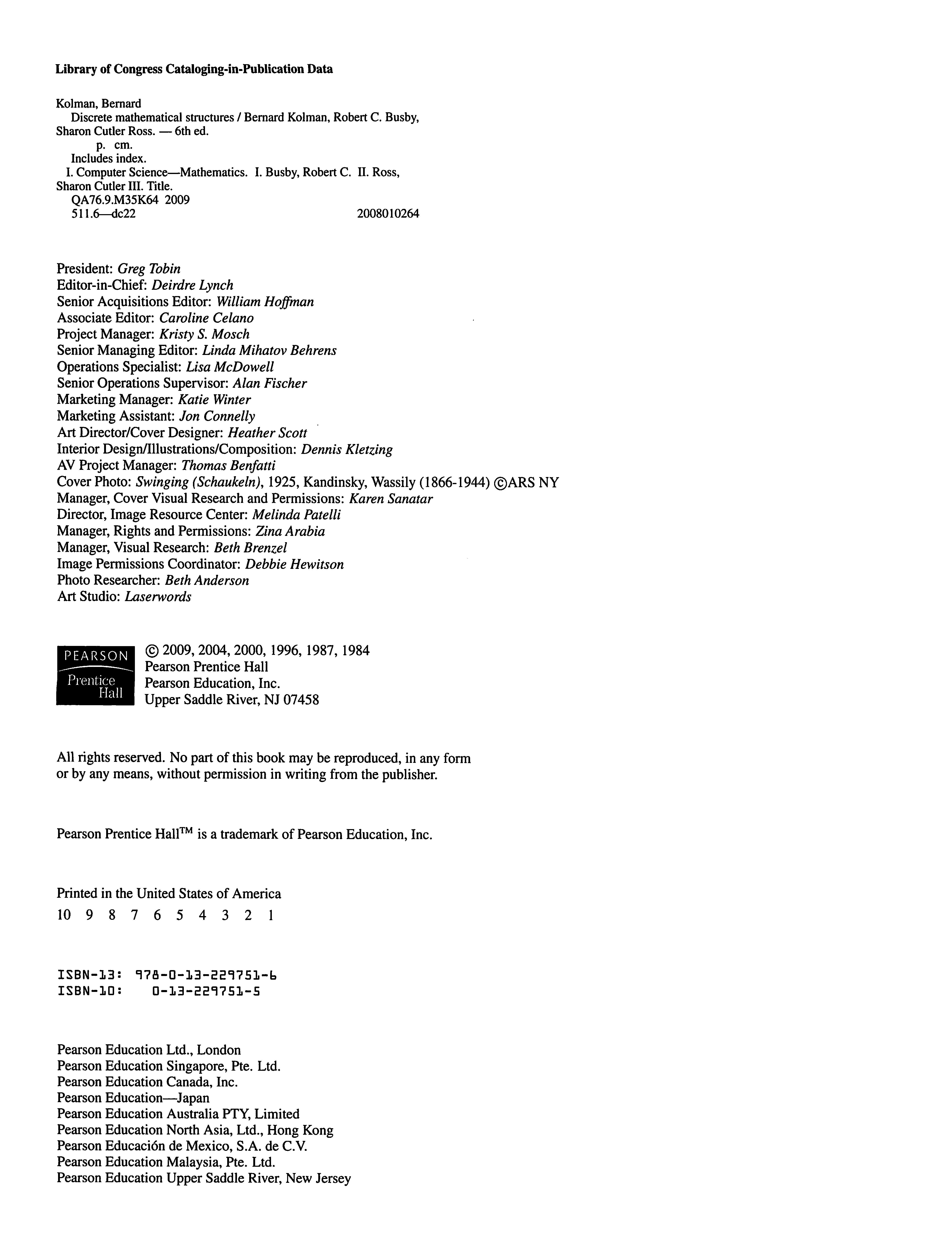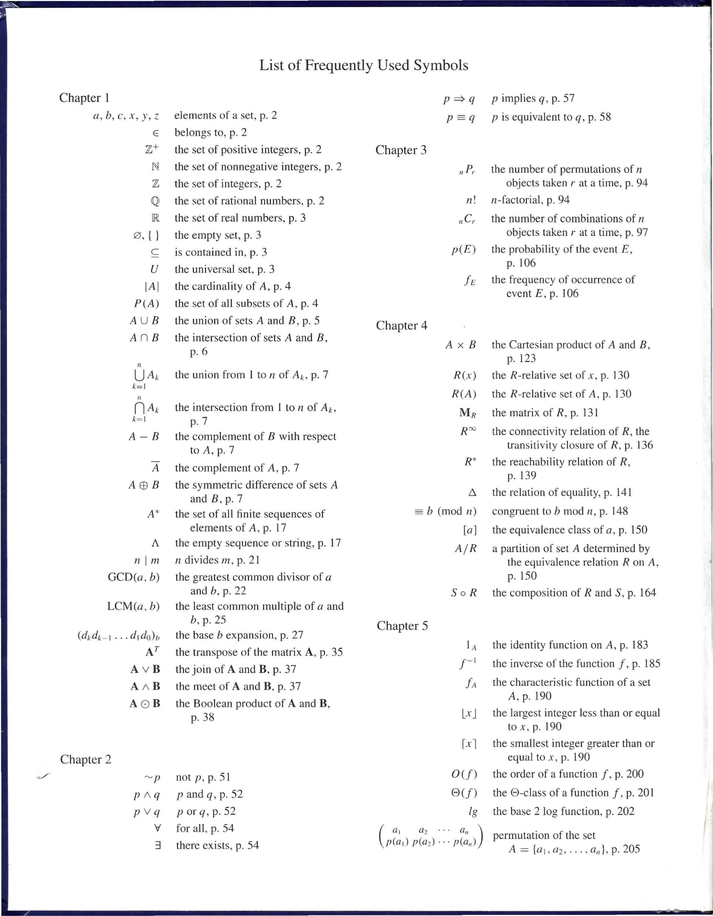 Discrete mathematicsisaninterestingcoursebothtoteachandtostudyatthe freshmanandsophomorelevelforseveralreasons.Itscontentismathematics, butmostofitsapplicationsandmorethan half ofitsstudentsarefrom computer scienceorengineeringconcentrations.Thus,carefulmotivationoftopicsandpre viewsofapplicationsareimportantandnecessarystrategies.Moreover,thereare a number of substantive and diverse topics covered inthe course, soatextmust proceed clearlyandcarefully, emphasizing keyideaswith suitable pedagogy.In addition,thestudentisgenerallyexpectedtodevelopan important newskill:the abilitytowriteamathematicalproof.Thisskillisexcellenttrainingforwriting computer programs.