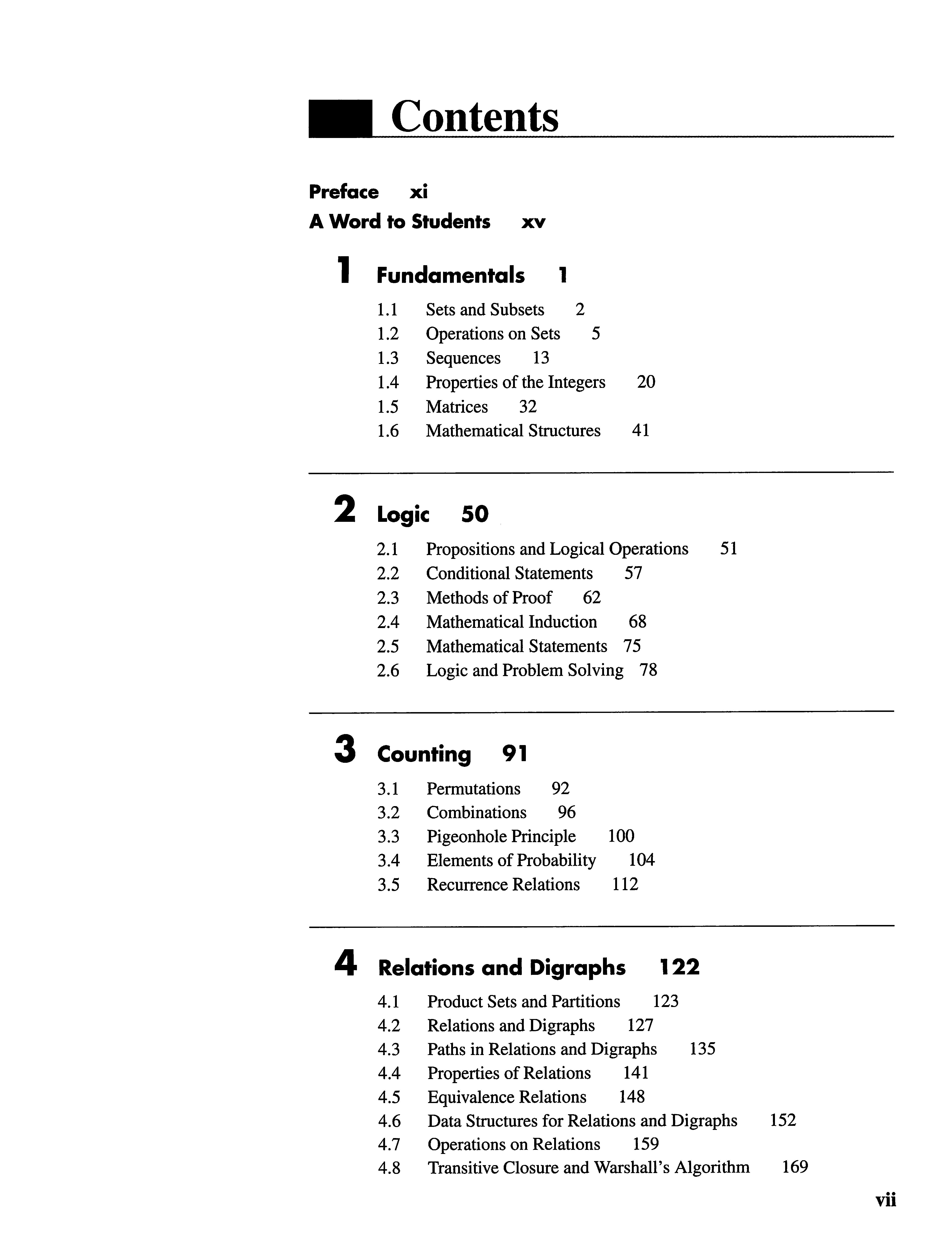Chapter 1 contains material thatis fundamental tothe course. This includes sets, subsets,andtheir operations; sequences; properties of theintegers including base n representations; matrices;and mathematical structures. Agoal of this chapter istohelp students developskillsin identifying patterns onmanylevels. Chapter 2 covers logicand related material, including methods of proof and mathematical induction. Although the discussion of proof is based onthis chapter, the commen taryon proofs continues throughout the book. Twonew sections, Mathematical Statements and LogicandProblem Solving have been added. This material isused tobriefly discuss the currently widely popular puzzle Sudoku and related puzzles. Chapter 3,oncounting,dealswith permutations, combinations, the pigeonhole principle, elementsof discrete probability,and recurrence relations.