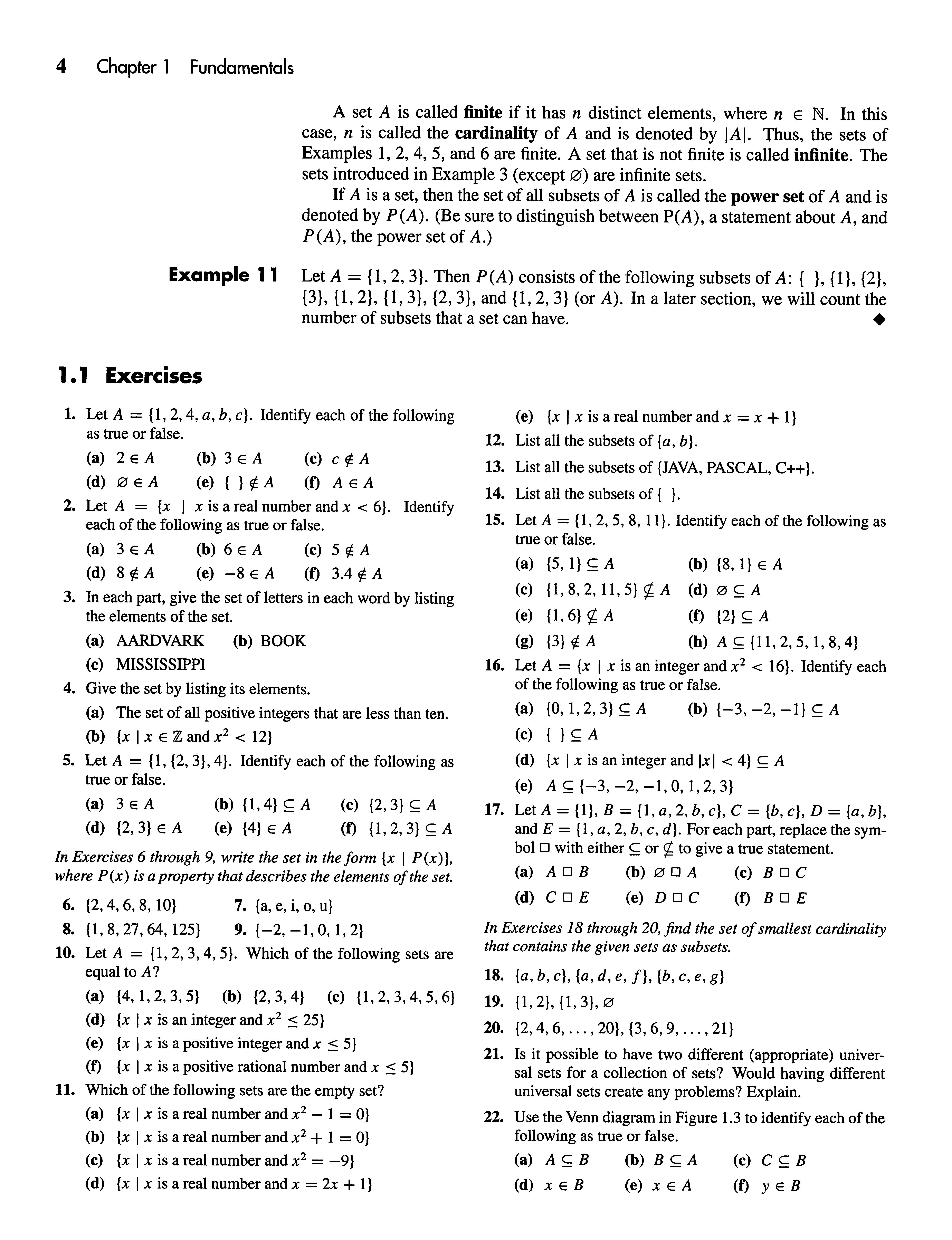 AsetAis called finite ifithas n distinct elements, where n gN.Inthis case, n iscalledthe cardinality ofAandisdenotedby|A|.Thus,thesetsof Examples 1,2,4,5,and6arefinite.Aset that isnotfiniteis called infinite. The setsintroducedinExample3(except 0) areinfinitesets.