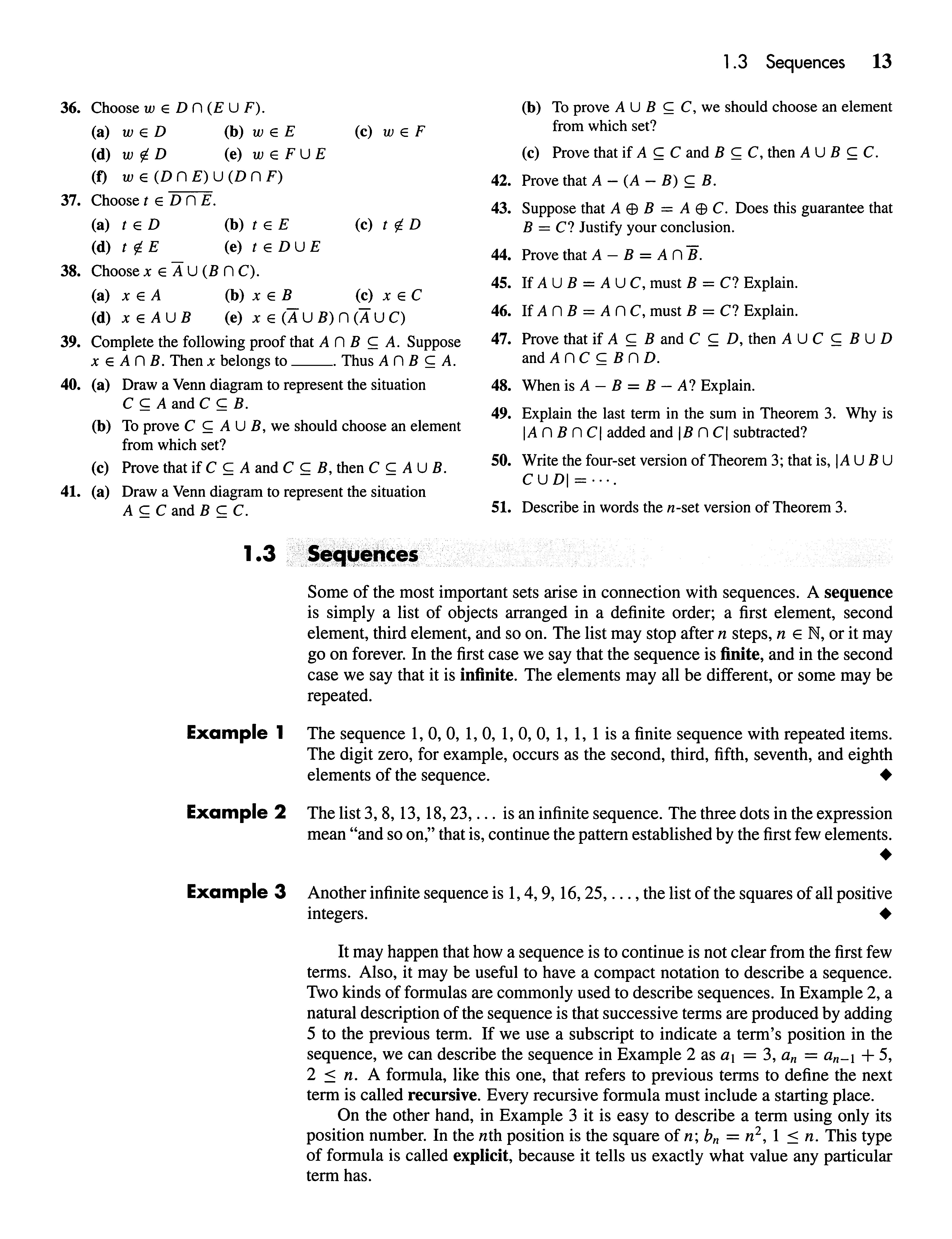 Some of themost important setsarisein connection with sequences. A sequence is simply alistof objects arranged ina definite order; afirst element, second element, third element, andsoon. The listmaystop after n steps, n e N, oritmay goonforever.Inthefirstcasewesaythatthe sequence is finite, andinthesecond casewesaythatitis infinite. The elements mayallbe different, orsomemaybe repeated.