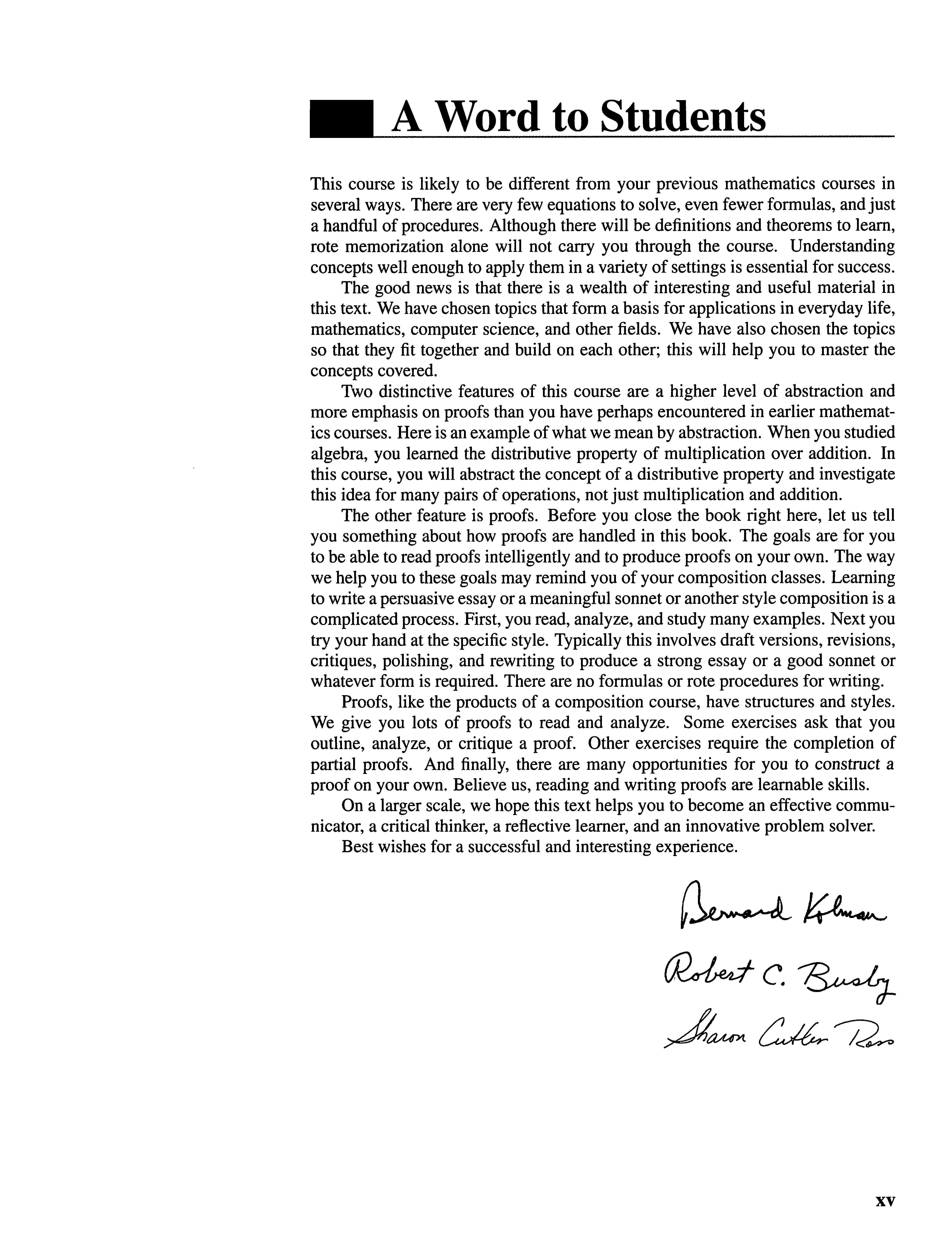 First, wehave limited both the areas covered andthe depth of coverage to what wedeemprudentin afirstcourse taughtatthefreshmanandsophomorelevel.We have identified aset of topicsthatwefeelare of genuine usein computer science and elsewhere andthatcanbe presented ina logically coherent fashion.Wehave presentedanintroductiontothesetopicsalongwithanindicationofhowtheycan bepursuedingreaterdepth.Thisapproachmakesourtextan excellent reference for upper-division courses.