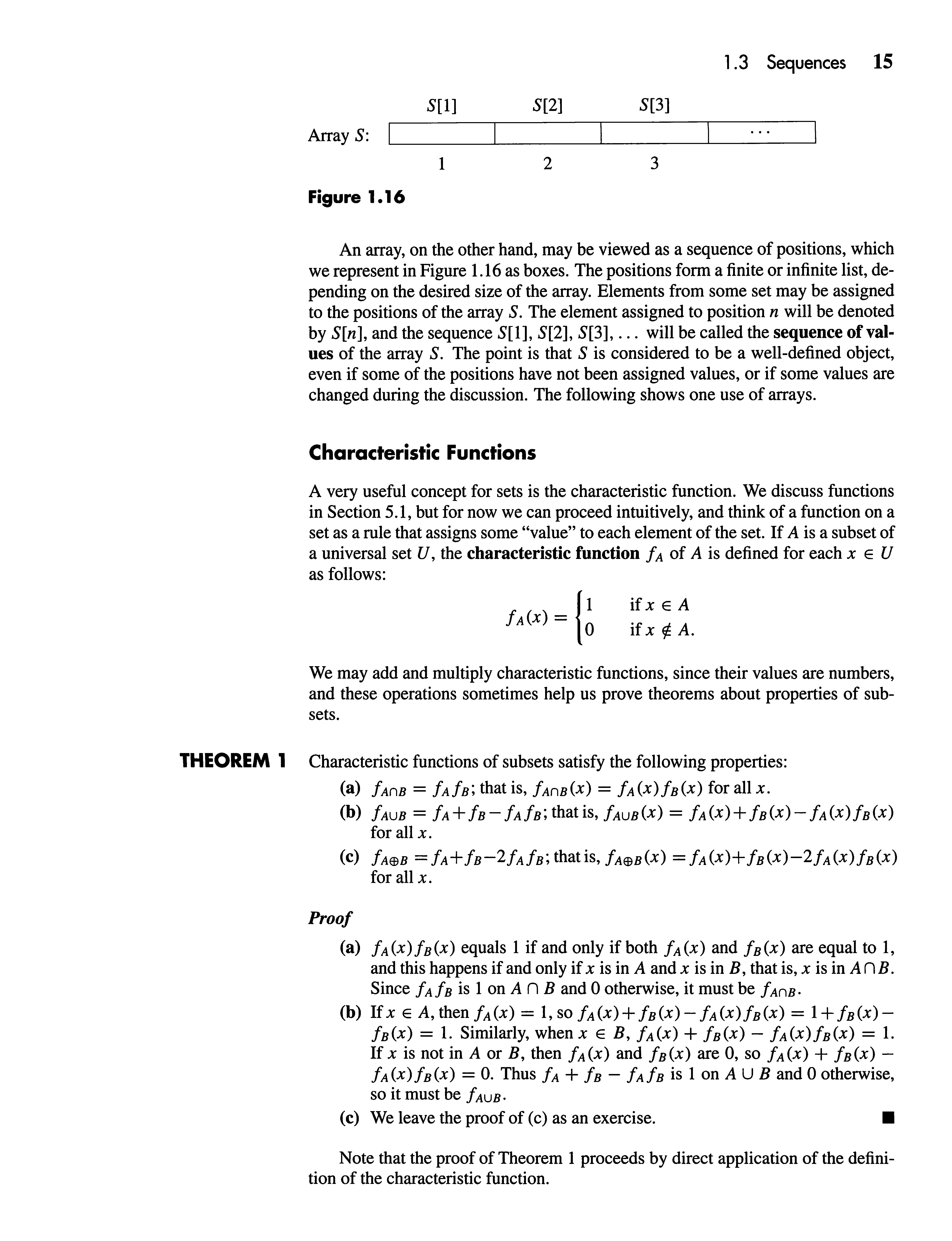 Anarray,ontheotherhand,maybeviewedasasequenceofpositions,which werepresentinFigure 1.16 asboxes.Thepositionsformafiniteorinfinitelist,de pendingonthedesiredsizeofthearray.Elementsfromsomesetmaybeassigned tothepositionsofthearray5.Theelementassignedtoposition n willbedenoted by S[n], andthesequence5[1], 5[2], 5[3],... willbecalledthe sequence of val ues ofthearray5.Thepointisthat5is considered tobea well-defined object, evenifsomeofthepositionshavenotbeen assigned values,orifsomevaluesare changed duringthediscussion.Thefollowingshowsoneuse of arrays.