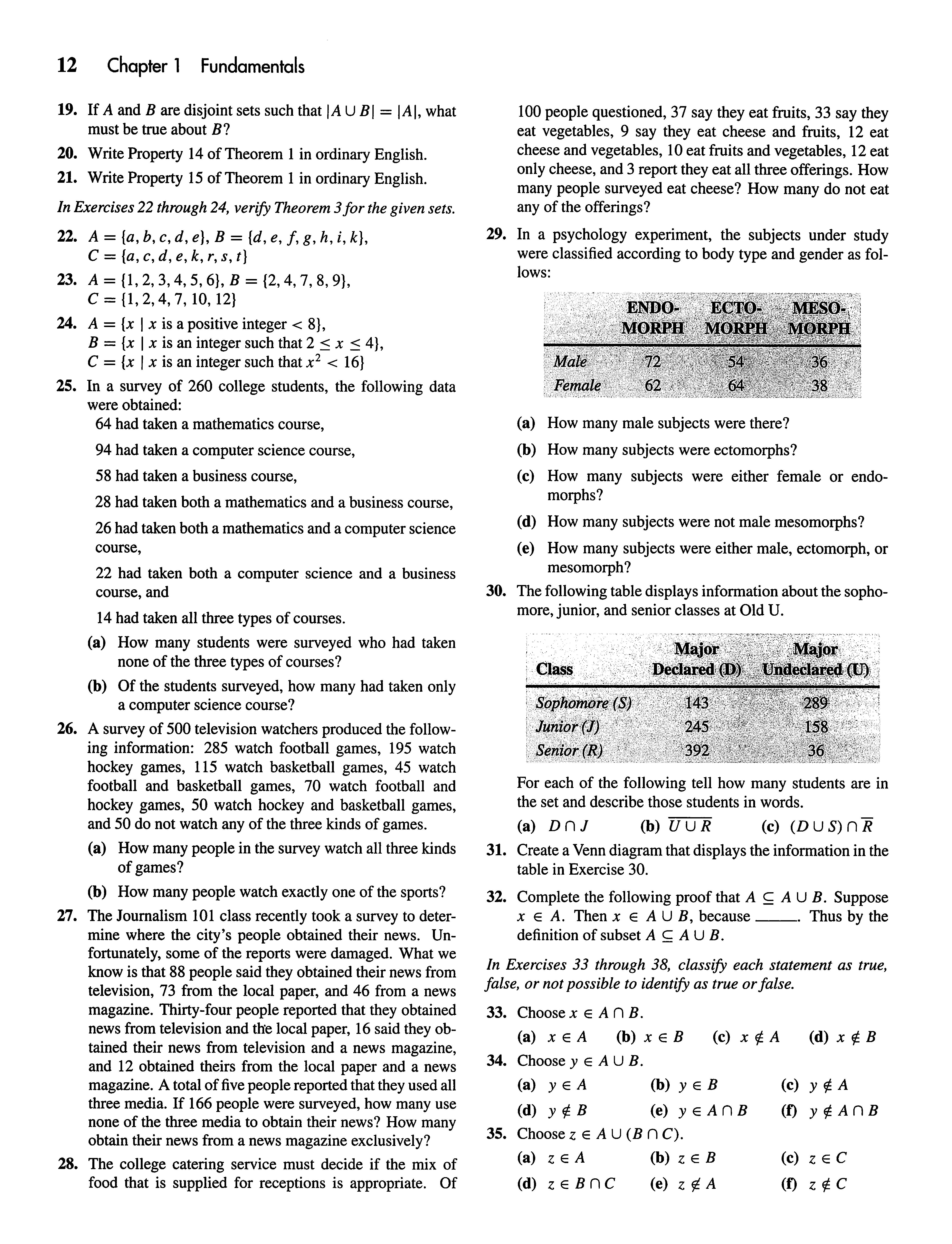 64 had taken a mathematics course, 94hadtakena computer science course, 58 had taken a business course, 28 had taken both a mathematics and a business course, 26hadtakenbotha mathematics anda computer science course, 22hadtakenbotha computer science anda business course, and 14hadtakenallthreetypes of courses.