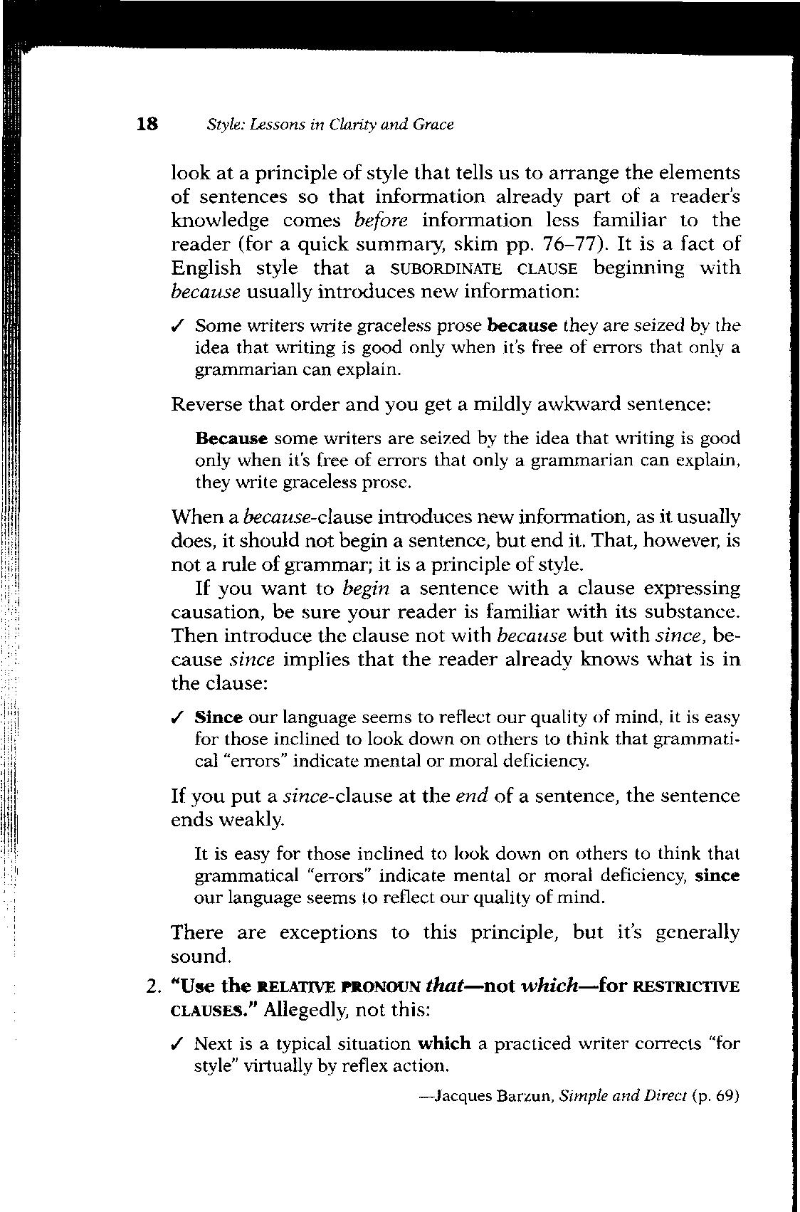 look at a principle of style that tells us to arrange the elements of sentences so that information already part of a reader's knowledge comes before information less familiar to the reader (for a quick summary, skim pp 76-77) It is a fact of English style that a SUBORDINATE CLAUSE beginning with because usually introduces new information: