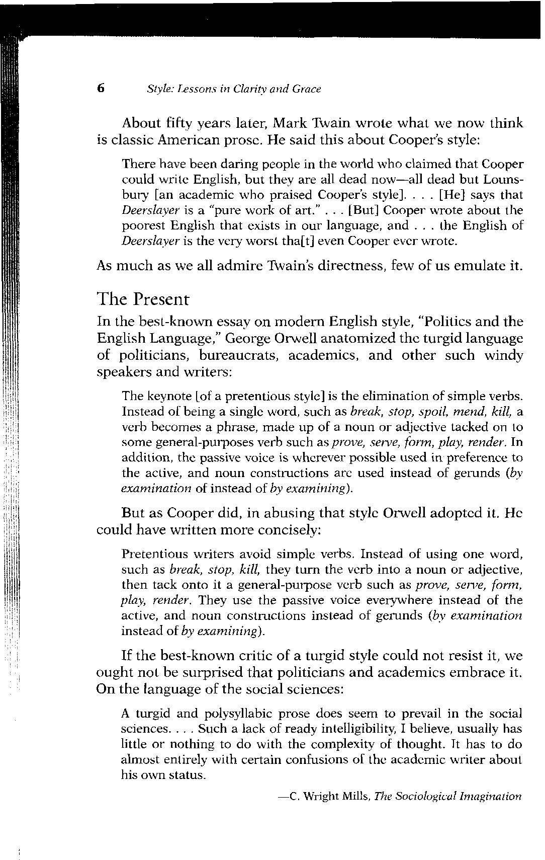 In the best-known essay on modern English style, "Politics and the English Language," George Orwell anatomized the turgid language of politicians, bureaucrats, academics, and other such windy speakers and writers: