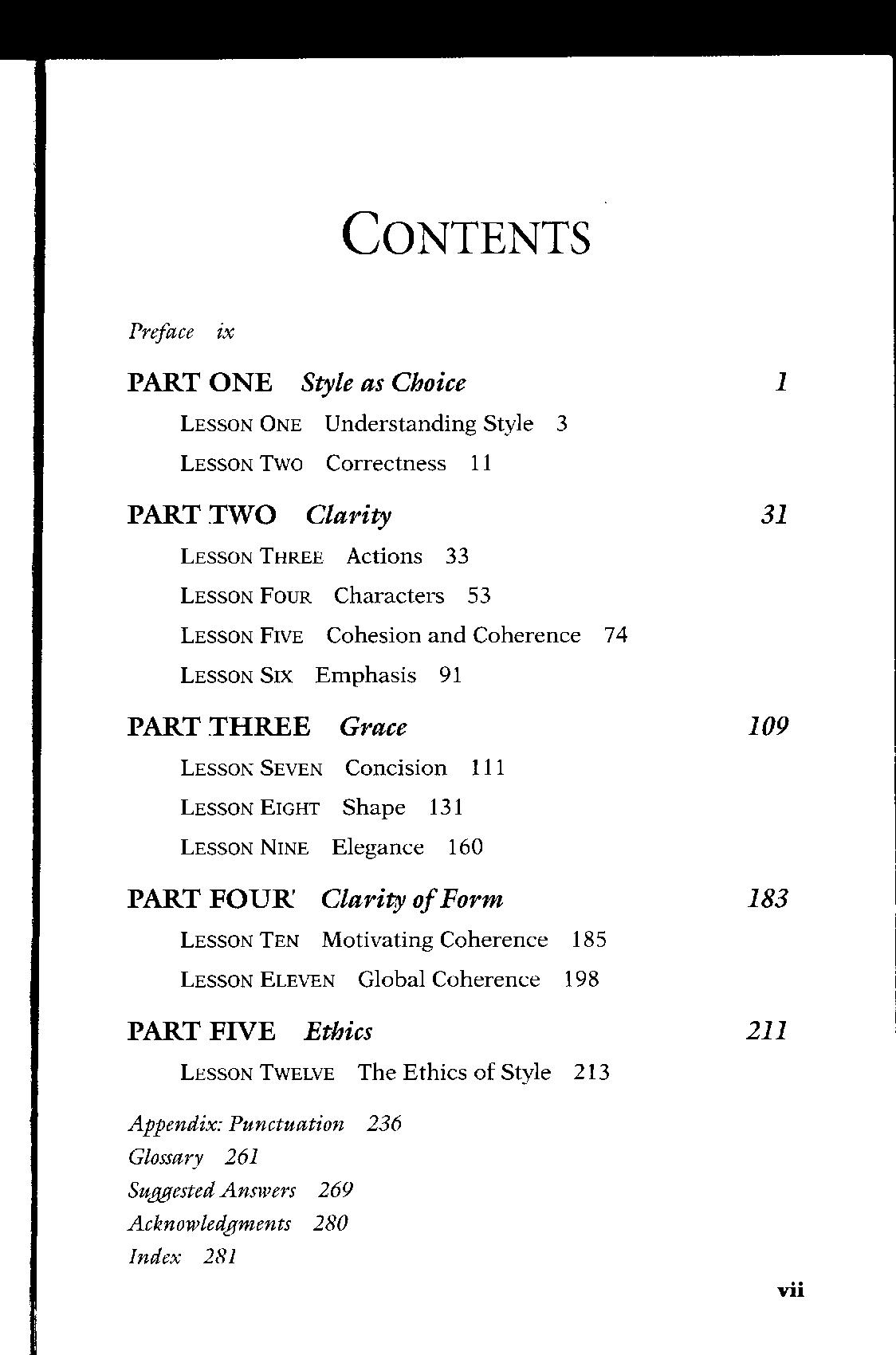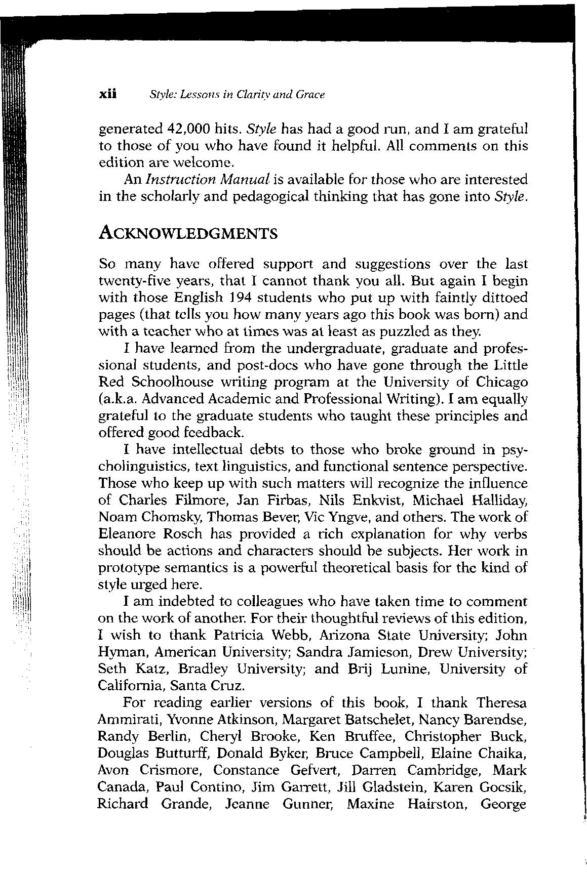 The obvious change to this ninth edition of Style is a new subtitle: no longer Ten Lessons in Clarity and Grace but just Lessons in ... To avoid changing the title of past editions, I added material under the headings of epilogue, appendix, and afterword, creating a hodge-podge of a book In the interest of straightening out this disorder, I've turned the two epilogues into lessons and put them before the lesson on ethics