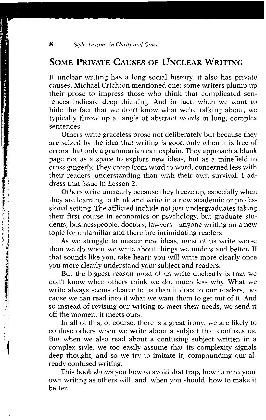 If unclear writing has a long social history, it also has private causes Michael Crichton mentioned one: some writers plump up their prose to impress those who think that complicated sentences indicate deep thinking And in fact, when we want to hide the fact that we don't know what we're talking about, we typically throw up a tangle of abstract words in long, complex sentences.