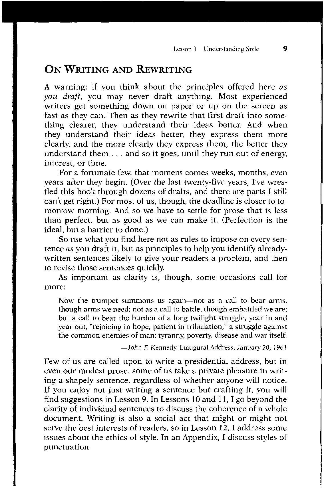 A warning: if you think about the principles offered here as you draft, you may never draft anything. Most experienced writers get something down on paper or up on the screen as fast as they can Then as they rewrite that first draft into something clearer, they understand their ideas better And when they understand their ideas better, they express them more clearly, and the more clearly they express them, the better they understand them . . . and so it goes, until they run out of energy, interest, or time.