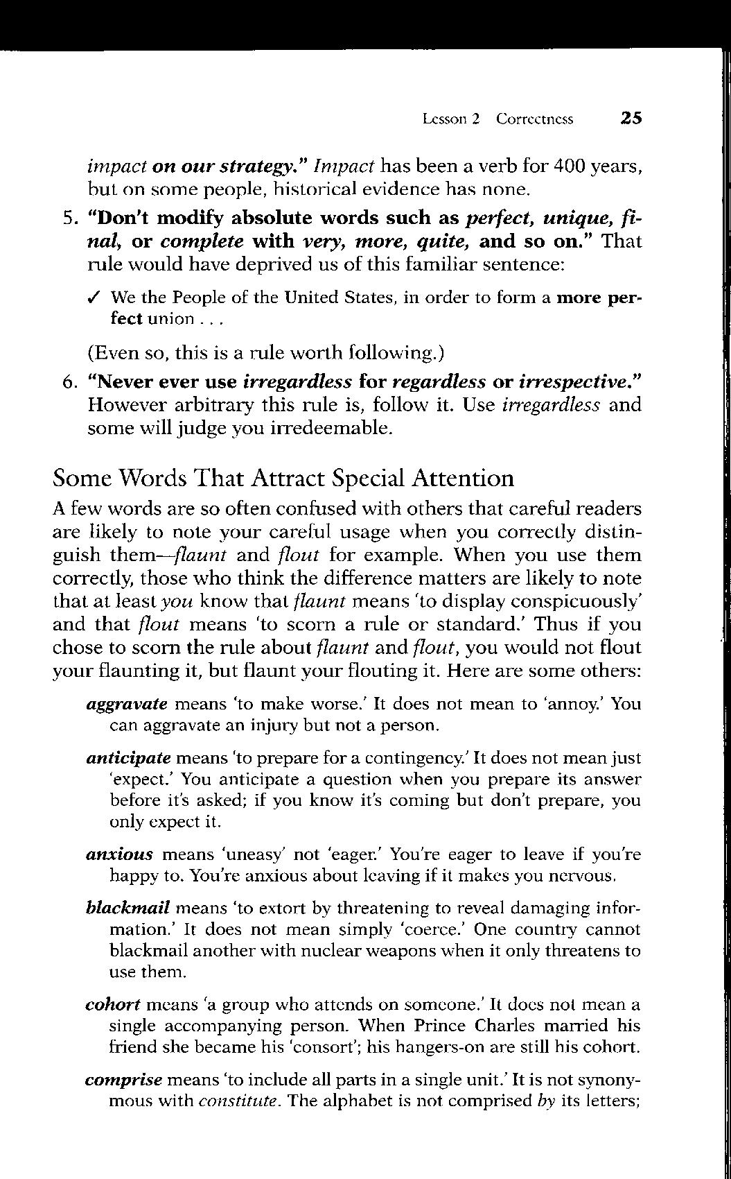 A few words are so often confused with others that careful readers are likely to note your careful usage when you correctly distinguish them—flaunt and flout for example When you use them correctly, those who think the difference matters are likely to note that at least you know that flaunt means 'to display conspicuously' and that flout means 'to scorn a rule or standard.' Thus if you chose to scorn the rule about flaunt and flout, you would not flout your flaunting it, but flaunt your flouting it. Here are some others: aggravate means 'to make worse.' It does not mean to 'annoy.' You can aggravate an injury but not a person anticipate means 'to prepare for a contingency.' It does not mean just 'expect.' You anticipate a question when you prepare its answer before it's asked; if you know it's coming but don't prepare, you only expect it.