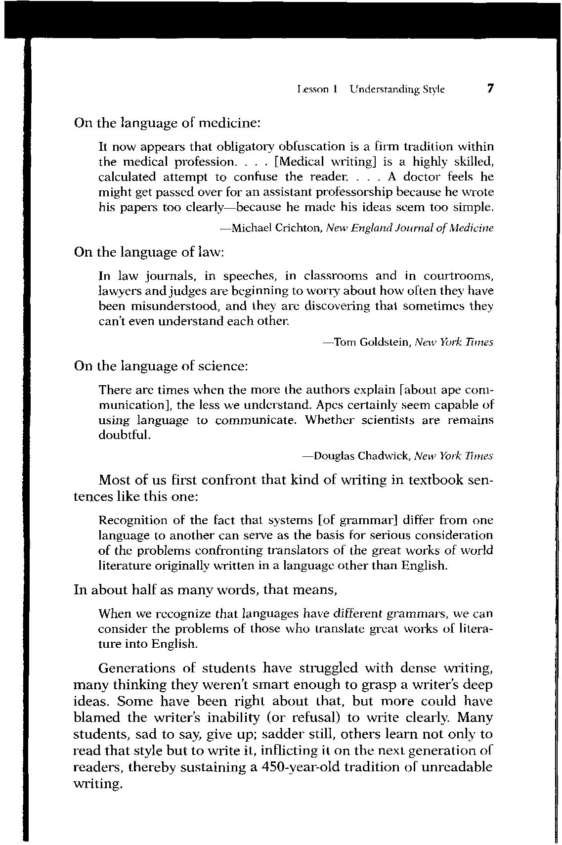 Generations of students have struggled with dense writing, many thinking they weren't smart enough to grasp a writer's deep ideas. Some have been right about that, but more could have blamed the writer's inability (or refusal) to write clearly Many students, sad to say, give up; sadder still, others learn not only to read that style but to write it, inflicting it on the next generation of readers, thereby sustaining a 450-year-old tradition of unreadable writing