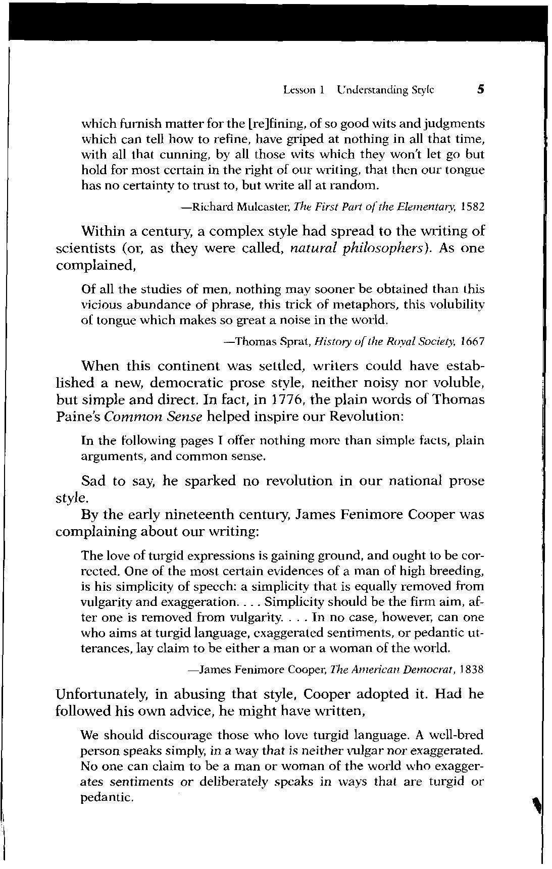 When this continent was settled, writers could have established a new, democratic prose style, neither noisy nor voluble, but simple and direct. In fact, in 1776, the plain words of Thomas Paine's Common Sense helped inspire our Revolution: