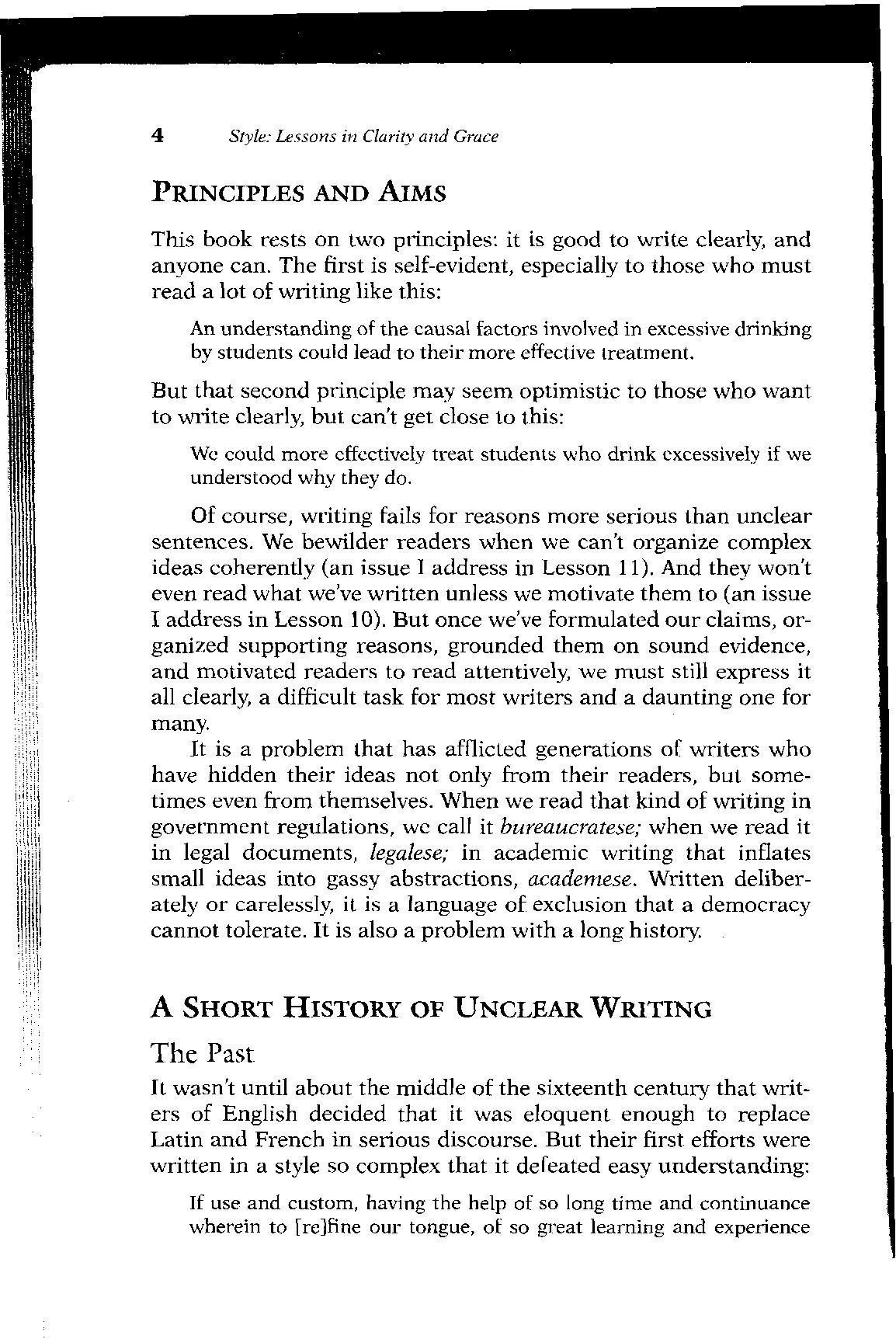 It is a problem that has afflicted generations of writers who have hidden their ideas not only from their readers, but sometimes even from themselves When we read that kind of writing in government regulations, we call it bureaucratese; when we read it in legal documents, legalese; in academic writing that inflates small ideas into gassy abstractions, academese. Written deliberately or carelessly, it is a language of exclusion that a democracy cannot tolerate It is also a problem with a long history