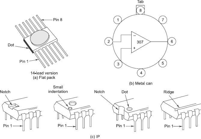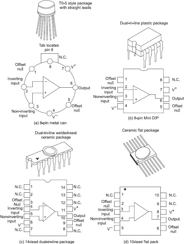 Op-amps are available in three commonly used packages—TO-5 (Metal can), Dual-in-Line Package (DIP), and ceramic flat package. These are shown in Fig. 1.4.