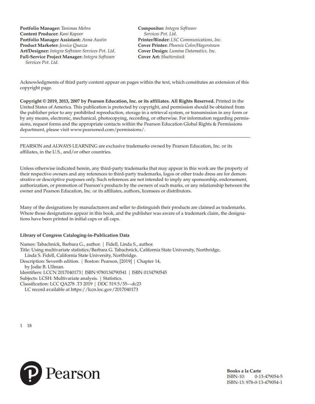 Ti tl e: Us in g mu l tivar ia te s tatis tics/Ba rbar a G. Taba cllnick, Ca liforni a Sta te U n iversity, North r i dge, Linda S. Fidell, Califo rni a Sta te U ni ver sity, Northri dge.