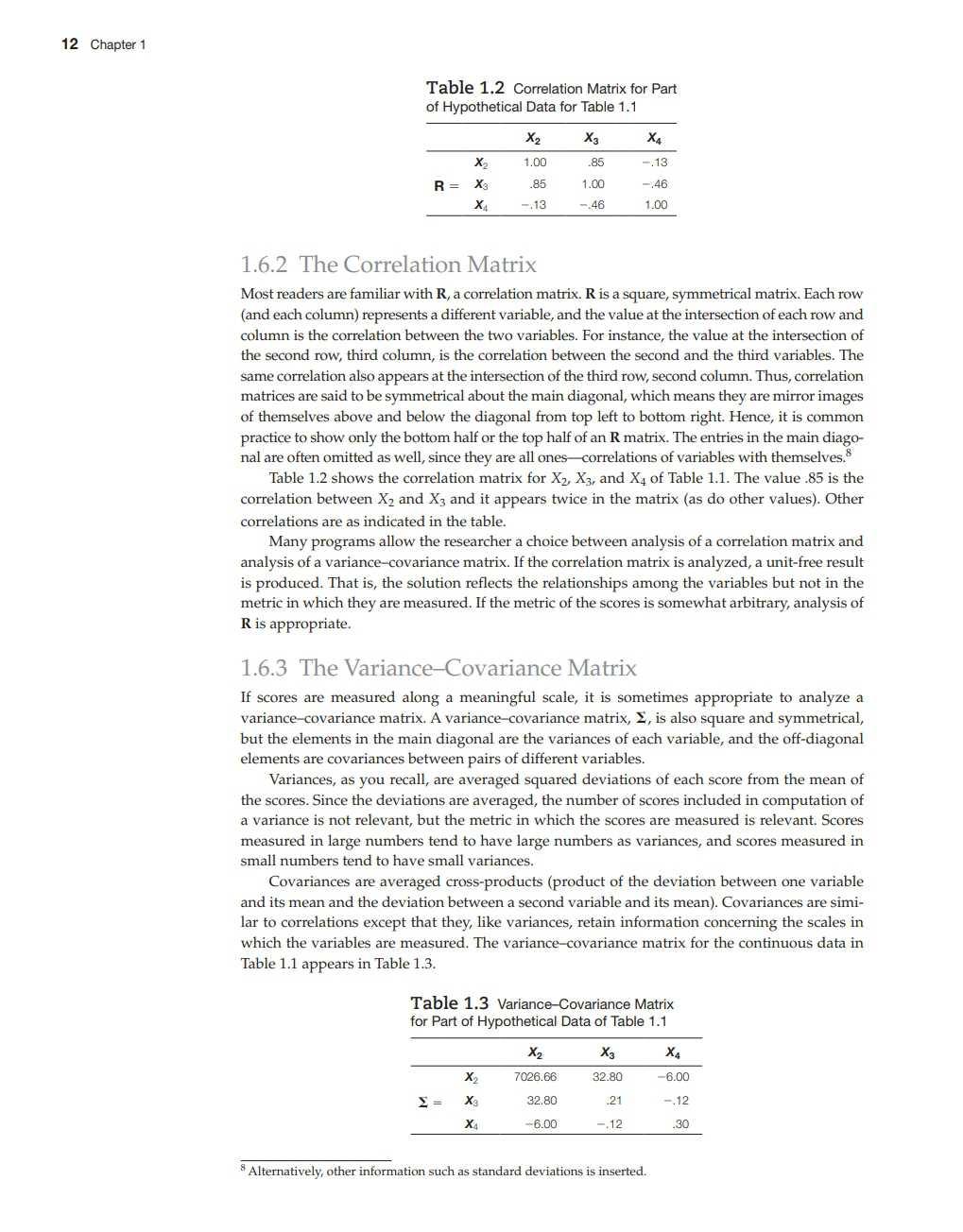 Cova riances are averaged cross-p roducts (p roduct o f th e d evia ti on b e t ween on e va riable and i ts m ean and th e dev iati on between a second va r iab le a n d i ts mean). Covarian ces a re similar to correla ti ons excep t tha t th ey, l i ke varia n ces, re tain infor ma ti on conce rnin g the scales in which the variables are measured. The var iance-cova r iance ma trix fo r the con tin uous da ta in Ta b le 1.1 appears in Ta b le 1.3.