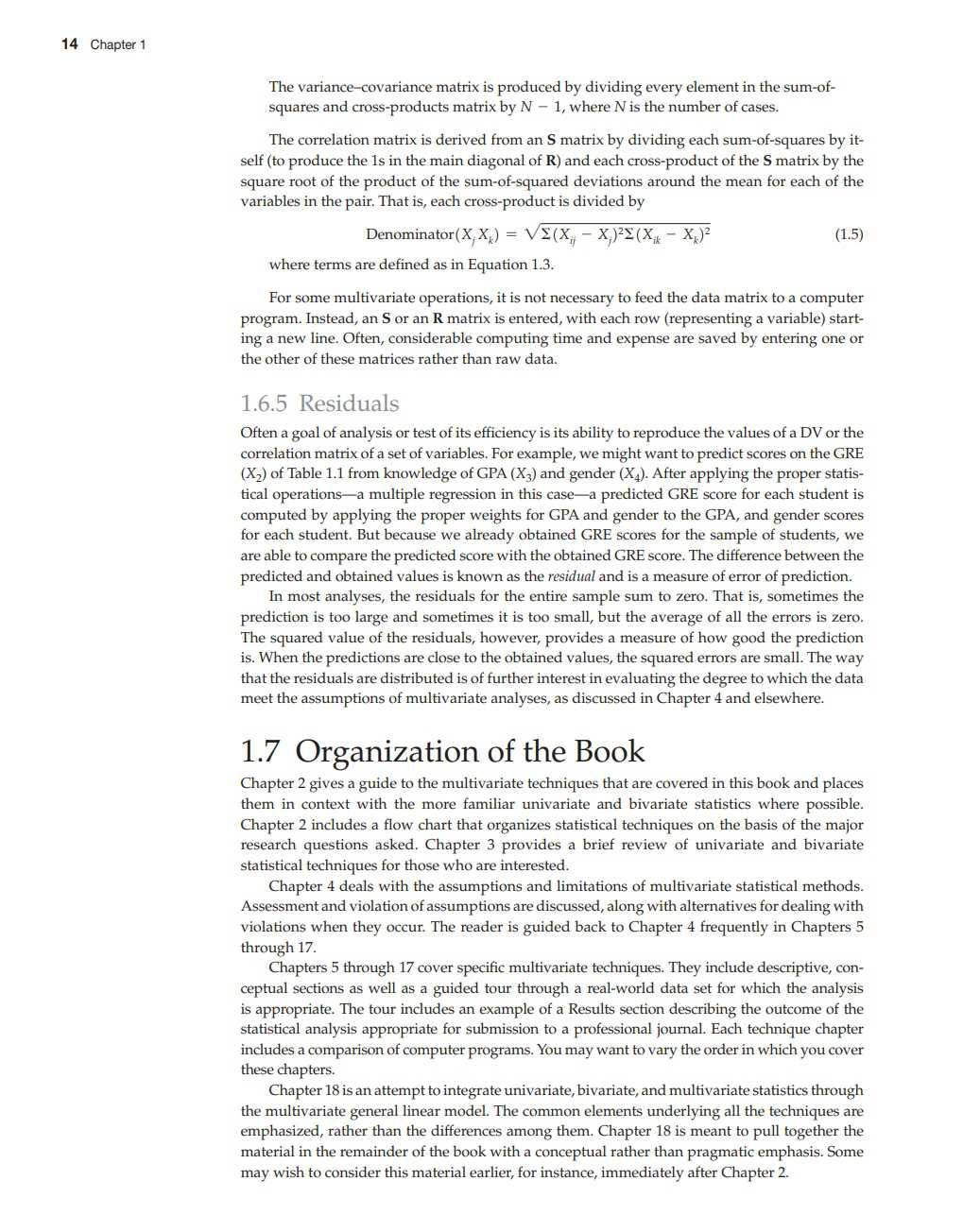 O ften a goa l of ana lysis o r test of i ts effi ciency is i ts ab ility t o r epr oduce the values of a D V o r the correla ti on matrix of a se t of vari abl es. Fo r exa mp le, we migh t wan t to p r ed ic t scor es on the GRE (X2 ) of Table 1. 1 fro m kn ow led ge of G PA (X3 ) and gen der (X4). After app ly ing the p roper sta tistica l oper a tions- a mu lt ip le r egression in this case- a p red icted GRE scor e fo r each s tu dent is computed b y applyin g the p roper weights fo r GPA and gender to the GPA, and gender scores fo r each stu d ent. Bu t b ecause we a lready ob tained G RE sco res fo r the sam p le of stu d en ts, we a r e able to compa r e the p red icted score with the ob t ained G RE score. The d ifference between t h e p r ed icted and ob t ained values is known as the residual and is a measur e o f error of p red iction. In m ost ana lyses, the residu als for th e ent ire sample su m to zero. Th a t is, som e tim es t h e p r ed icti on is too large and so me tim es it is too sma ll , b u t the aver age of a ll t h e err ors is zer o. The squ a r ed valu e o f the resi d u als, however, p rov id es a measu re of how good th e p redic ti on is. When th e p redic ti ons a re close to the ob tained va lues, th e squa r ed erro rs are sma ll . The way tha t the resi d u als a re d is trib u ted is of fu r the r interest in eva l ua t ing th e degree t o w h ich the d ata m eet the assump ti on s o f mu l ti va ri ate a n a lyses, as d iscu ssed in C h apter 4 and e lsewher e.