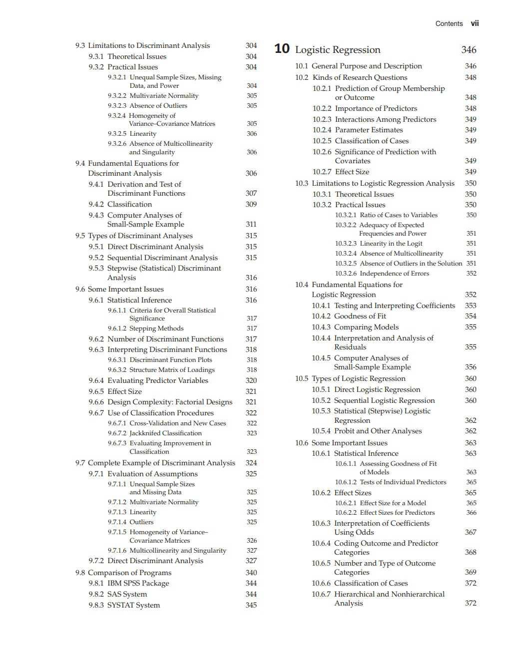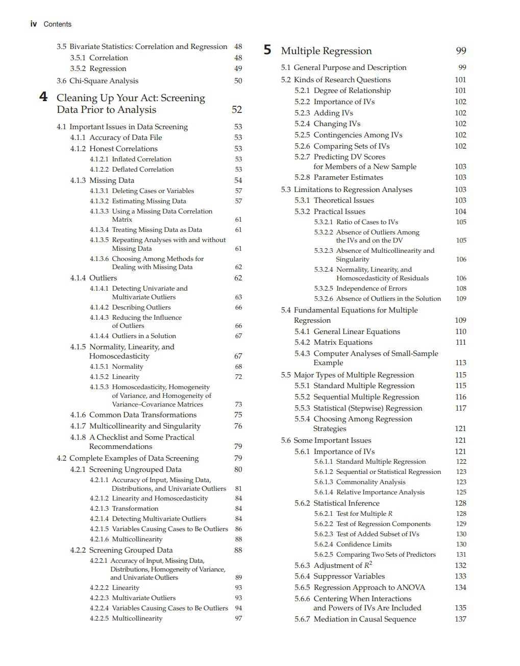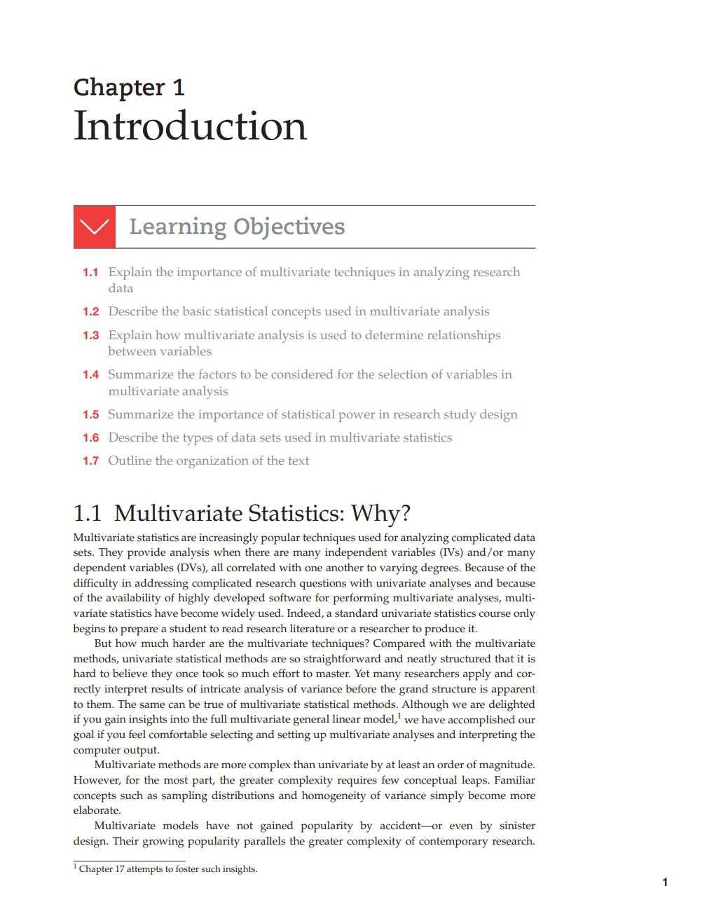 C hap ters 5 throu gh 17 cover specific mul tivaria te techni qu es. They include d escr ip tive, conceptual section s as well as a guid ed tour throu gh a real-world data set fo r which the anal ysis is appropria t e. The t o ur includ es an exam p le of a Res ul ts sec ti on describ ing the outcome of the s t atis tical anal ysis approp riate for submiss ion to a p rofessional journal. Ea ch technique chap ter includ es a com parison of com p u ter p rogr ams. Yo u m ay want t o vary the o rder in whi ch you cover these chapter s.