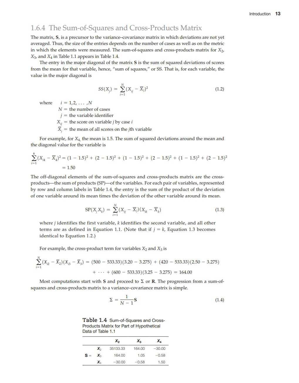 Th e ma trix, S, is a precursor to the va riance-cova riance ma tr ix in w h ich devia ti ons are n o t yet averaged. Thu s, the s ize of the entries depen ds on the number of cases as well as o n the metric in which the e lements were measured. The s um -of-s quares a n d cross-p r od u cts ma tr ix fo r Xz, X3 , and X4 in Table 1.1 appea rs in Table 1.4.