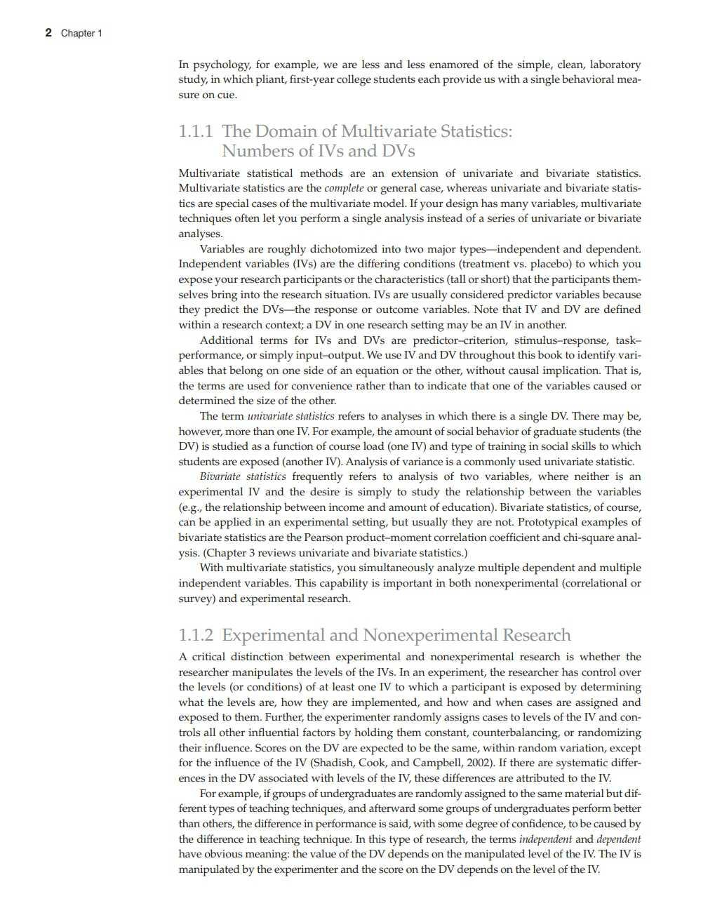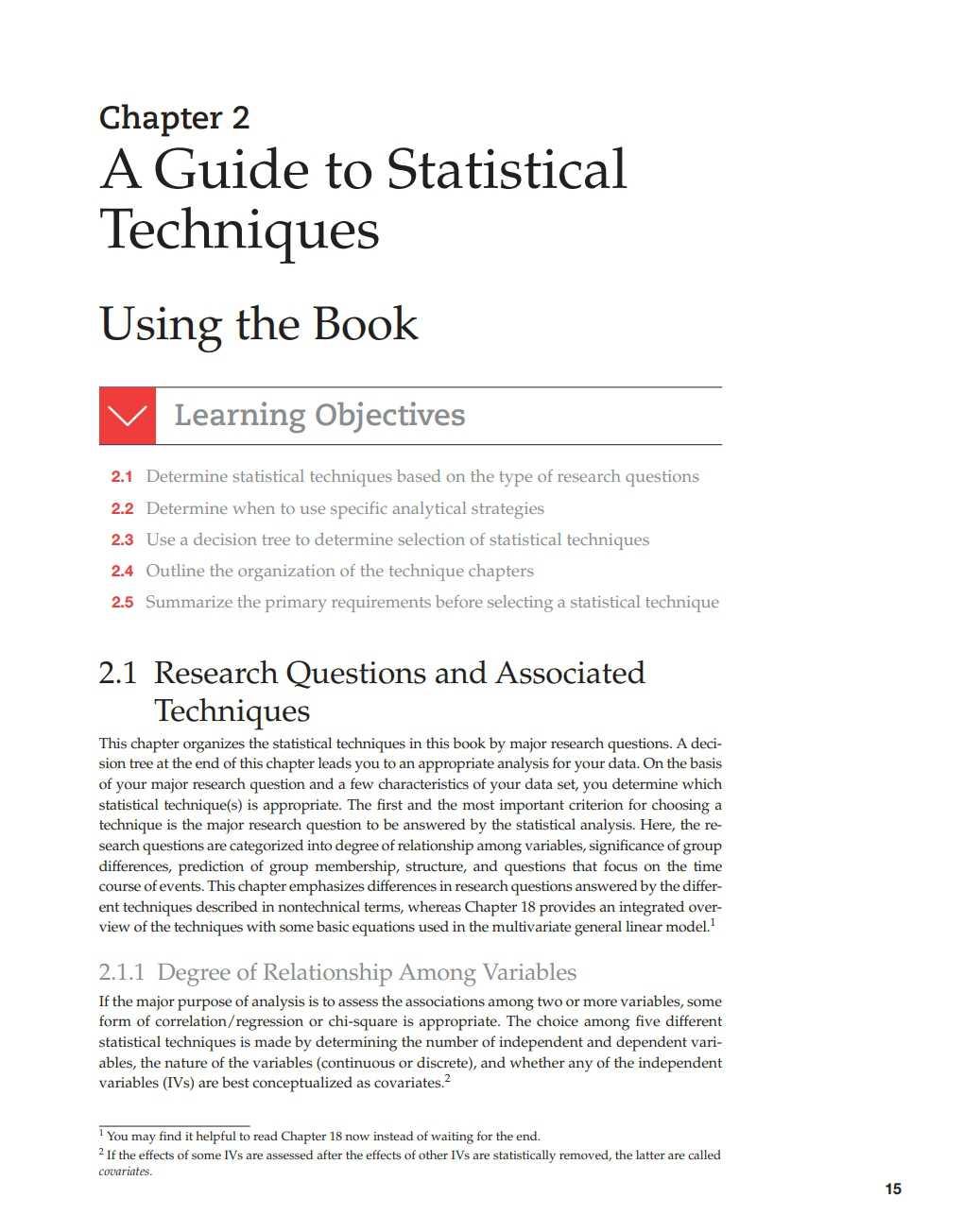 Chap ter 2 gives a gui de t o the m u l ti va ria t e t echniqu es th at are cove red in this book and p l aces the m in con tex t wi th the m o r e famil iar u n i varia te an d b iva r iate statisti cs w h er e possib le. C hap ter 2 incl udes a fl ow chart tha t o r ganizes s tatis tical t echni ques on th e basis of the m ajor resea r ch q u esti on s ask ed. C h apter 3 provid es a br ief review of u n ivari ate a n d b i va r ia t e s ta tistical techni ques fo r those who are interest ed.