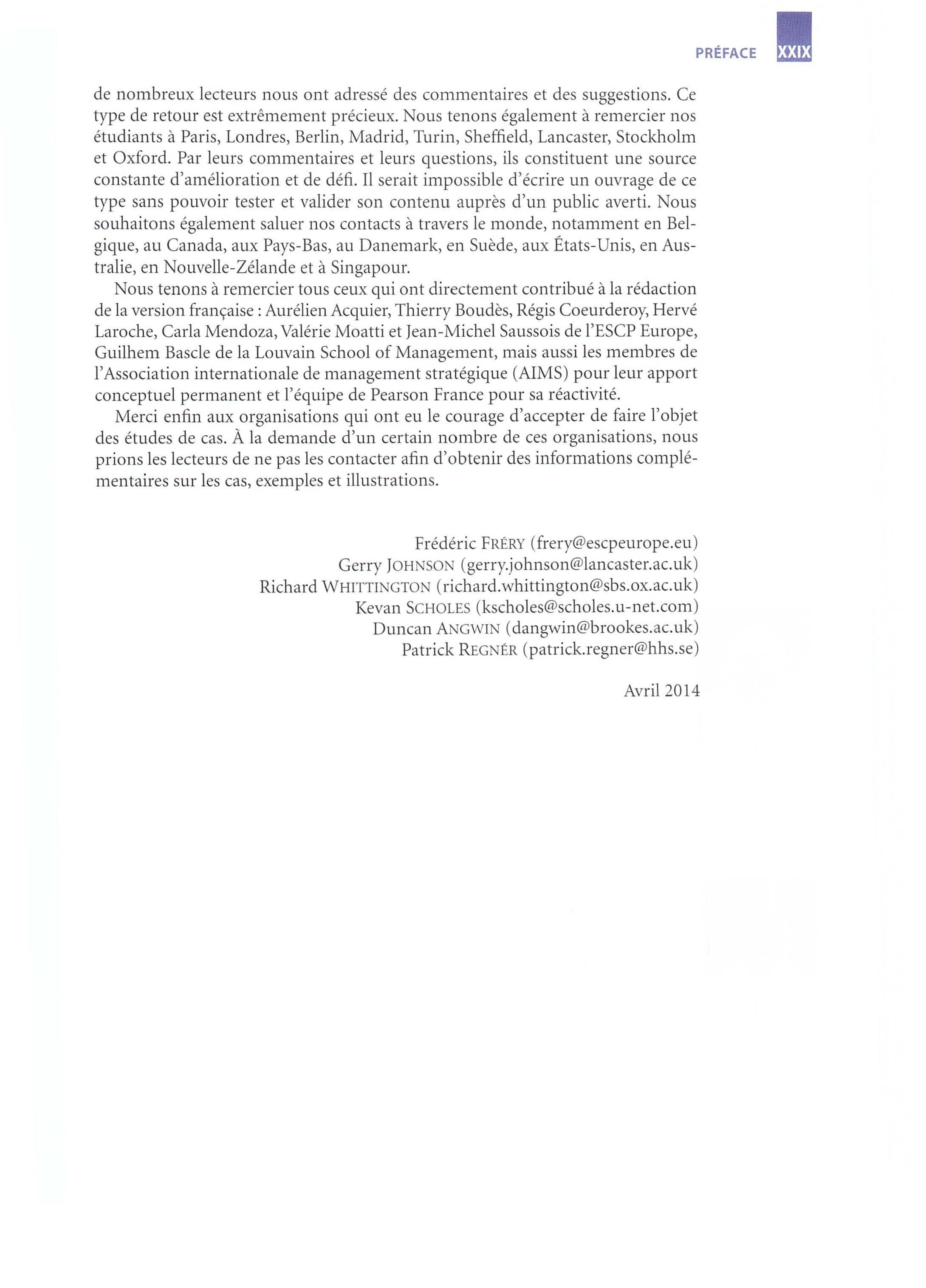 Nous tenons à remercier tous ceux qui ont directement contribué à la rédaction de la version française :Aurélien Acquier, Thierry Boudès, Régis Coeurderoy, Hervé Laroche, Carla Mendoza, Valérie Moatti et Jean-Michel Saussois de l'ESCP Europe, Guilhem Bascle de la Louvain School of Management, mais aussi les membres de l'Association internationale de management stratégique (AIMS) pour leur apport conceptuel permanent et l'équipe de Pearson France pour sa réactivité.