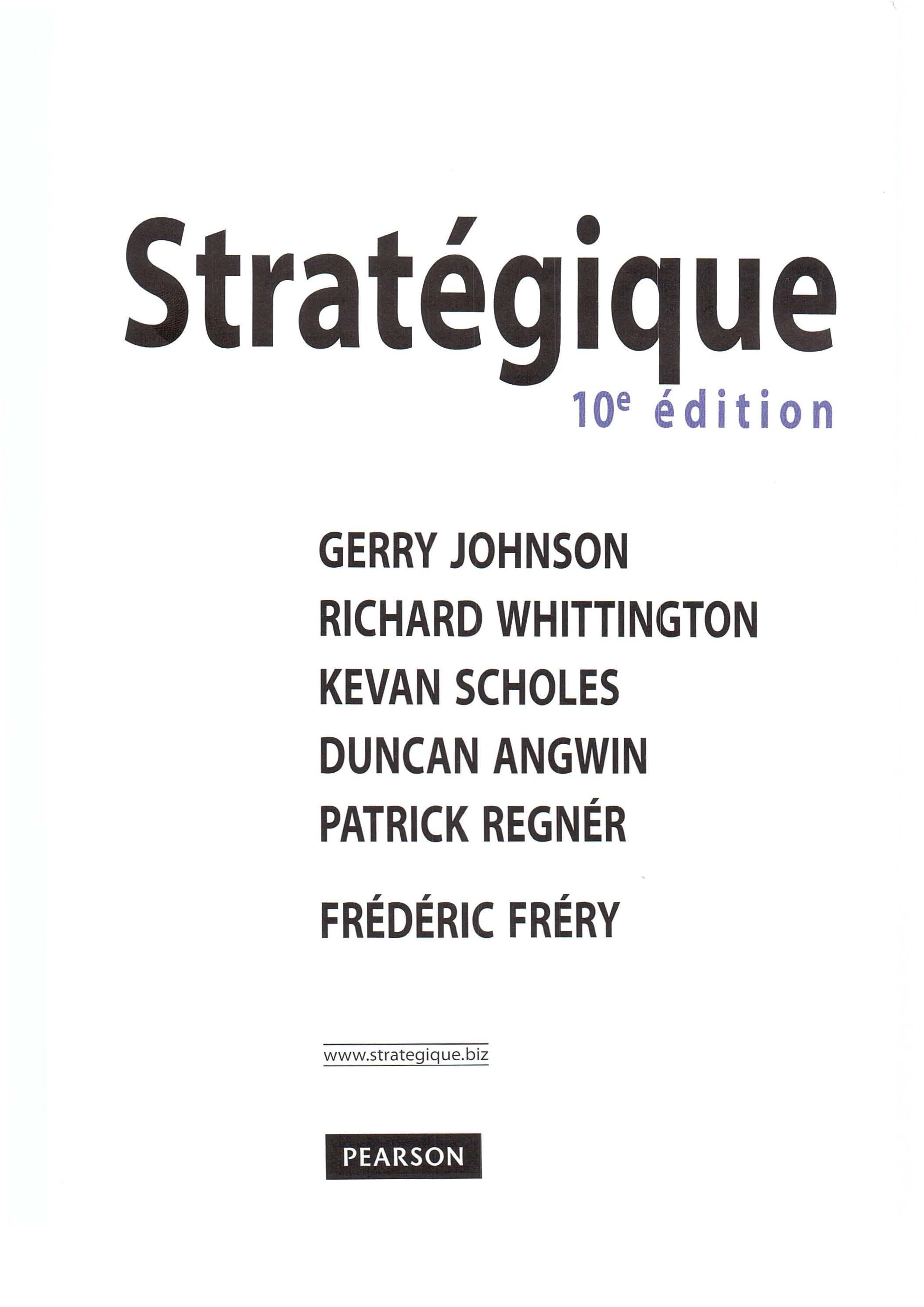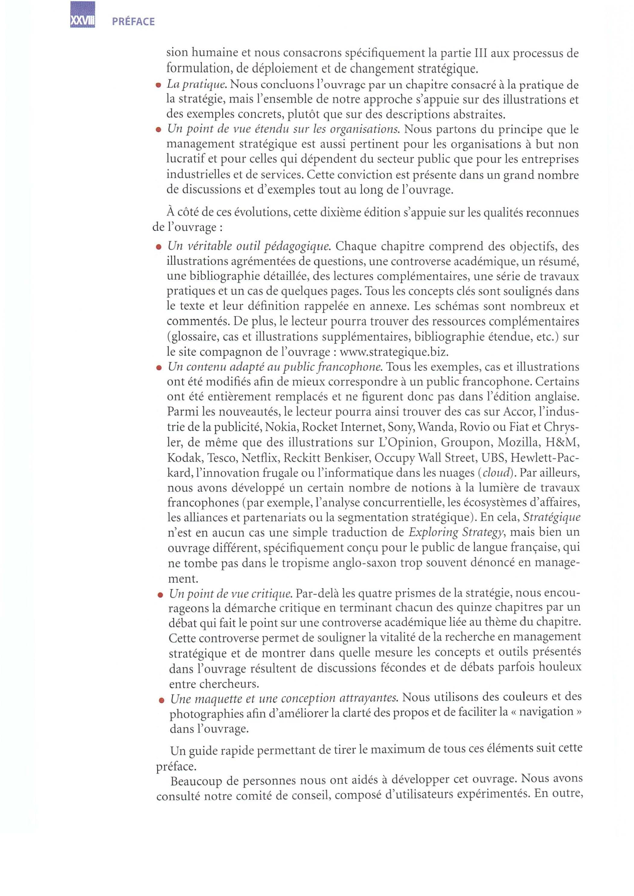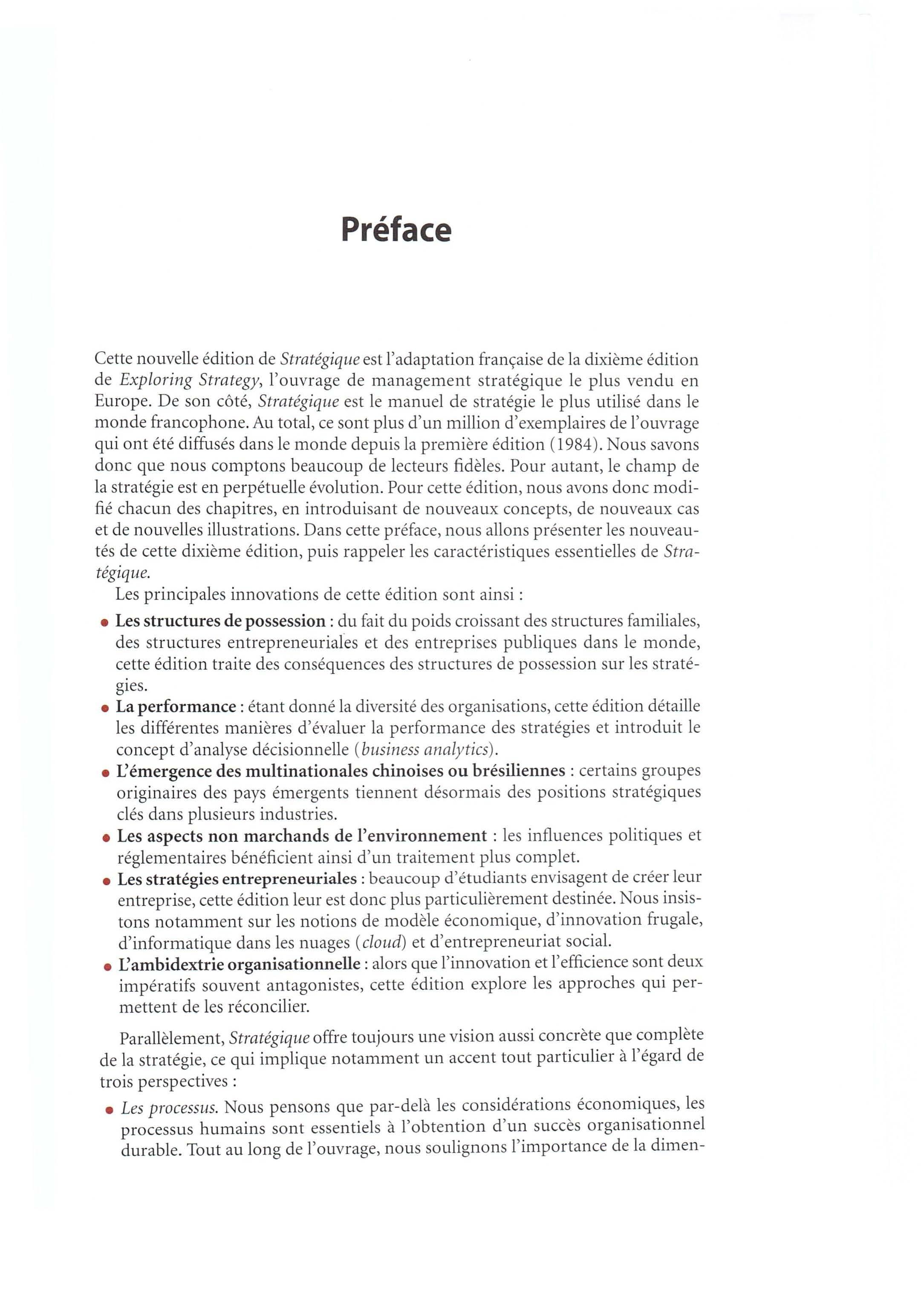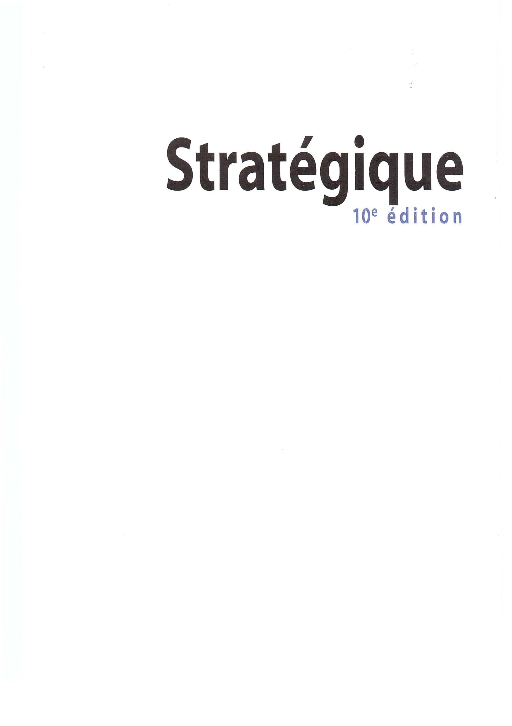 Cette nouvelle éd ition de Stratégique est l'adaptation française de la dixième édition de Exploring Strategy, l'ouvrage de management stratégique le plus vendu en Europe. De son côté, Stratégique est le manuel de stratégie le plus utilisé dans le monde francophone. Au total, ce sont plus d'un million d'exemplaires de l'ouvrage qui ont é té diffusés dans le monde depuis la première édition (1984). Nous savons donc que nous comptons beaucoup de lecteurs fidèles. Pour autant, le champ de la stra t égie est en perpétuelle évo lut ion. Pour cette édition, nous avons donc modifié chacun des chapitres, en introduisant de nouveaux concepts, de nouveaux cas et de nouvelles illustrations Dans cette préface, nous allons présenter les nouveautés de cette dixième édition, puis rappeler les caractéristiques essentielles de Stratégique.