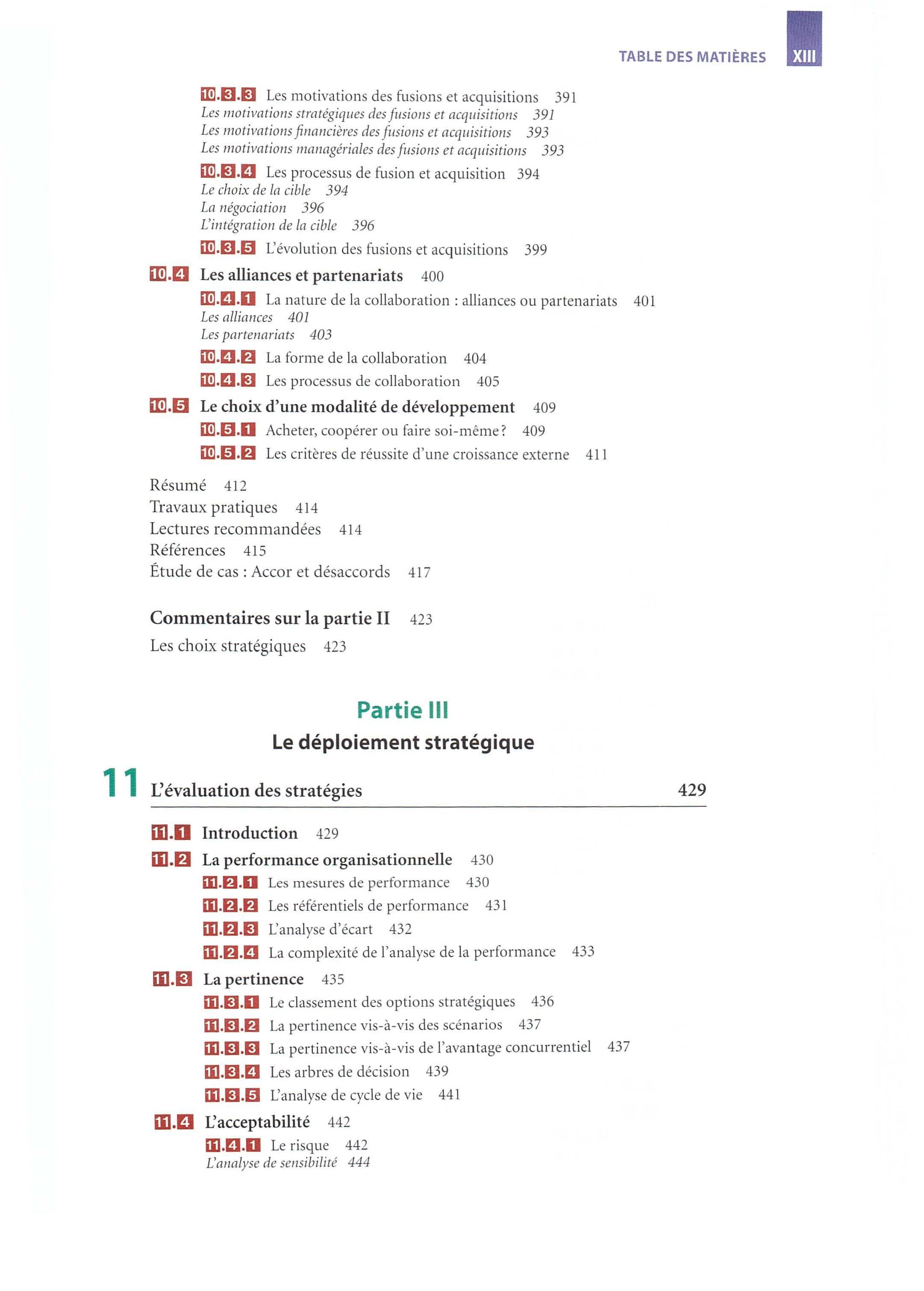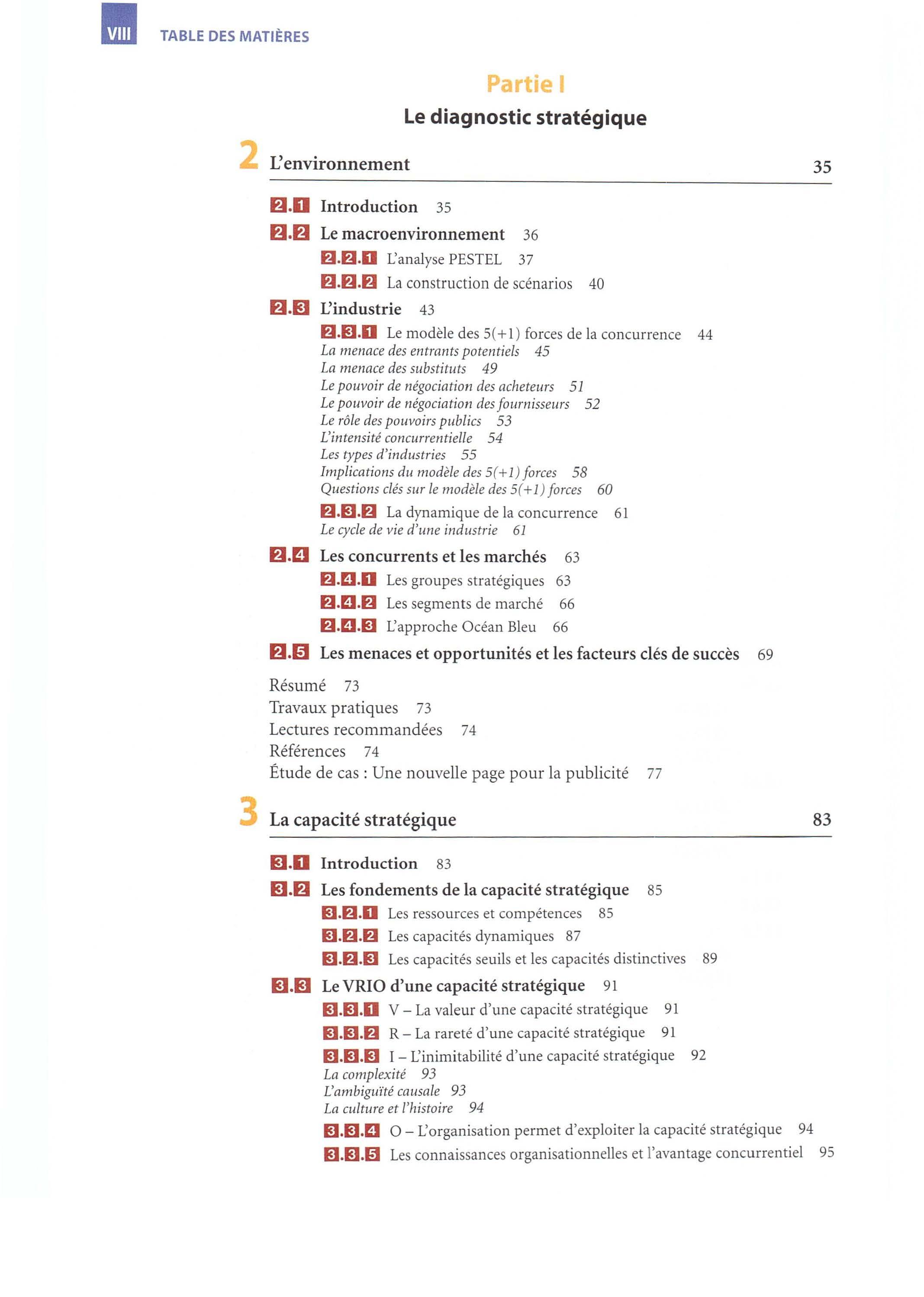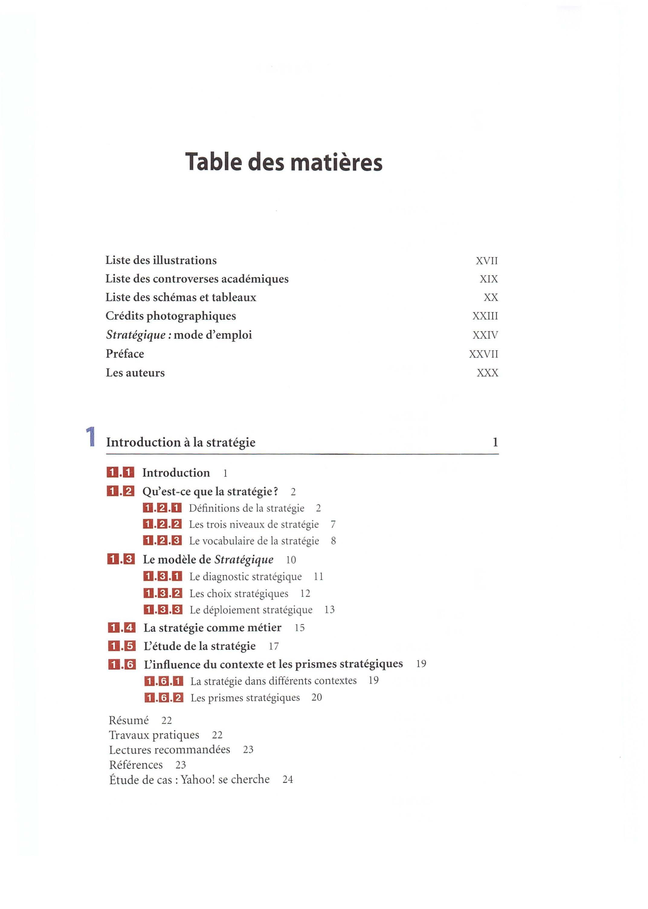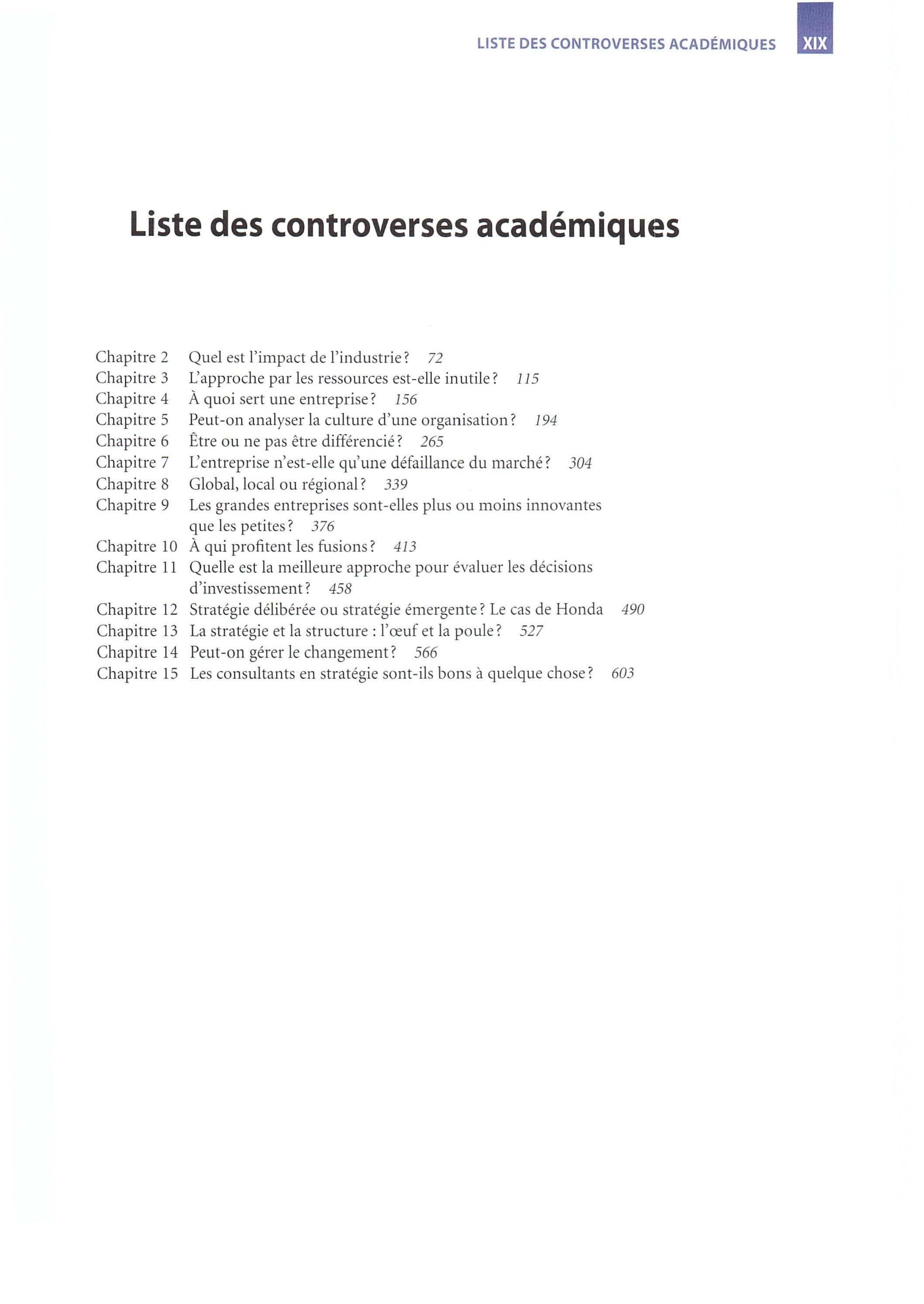 • Un point de vue critique Par-delà les quatre prismes de la stratégie, nous encourageons la démarche critique en terminant chacun des quinze chapitres par un débat qui fa it le point sur une controverse académique liée au thème du chapitre. Cette controverse permet de souligner la vitalité de la recherche en management stratégique et de montrer dans quelle mesure les concepts et outils présentés dans l'ouvrage résultent de discussions fécondes et de débats parfois houleux entre chercheurs.