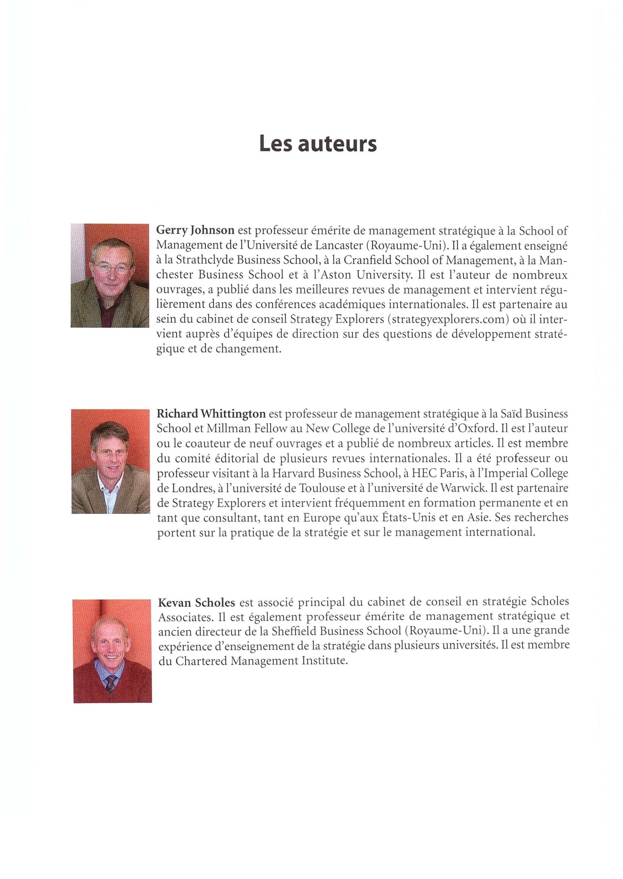 Gerry Johnson est professeur émérite de management stratégique à la School of Management de l'Université de Lancaster (Royaume-Uni). Il a également enseigné à la Strathclyde Business School, à la Cranfield School of Management, à la Manchester Business School et à l'Aston University. Il est l'auteur de nombreu x ouvrages, a publié dans les meilleures revues de management et intervient régulièrement dans des conférences académiques internationales . Il est partenaire au sein du cabinet de conseil Strategy Explorers (s trategyexplorers com ) où il intervient auprès d 'é quipes de direction sur des questions de développement stratégique et de changement.