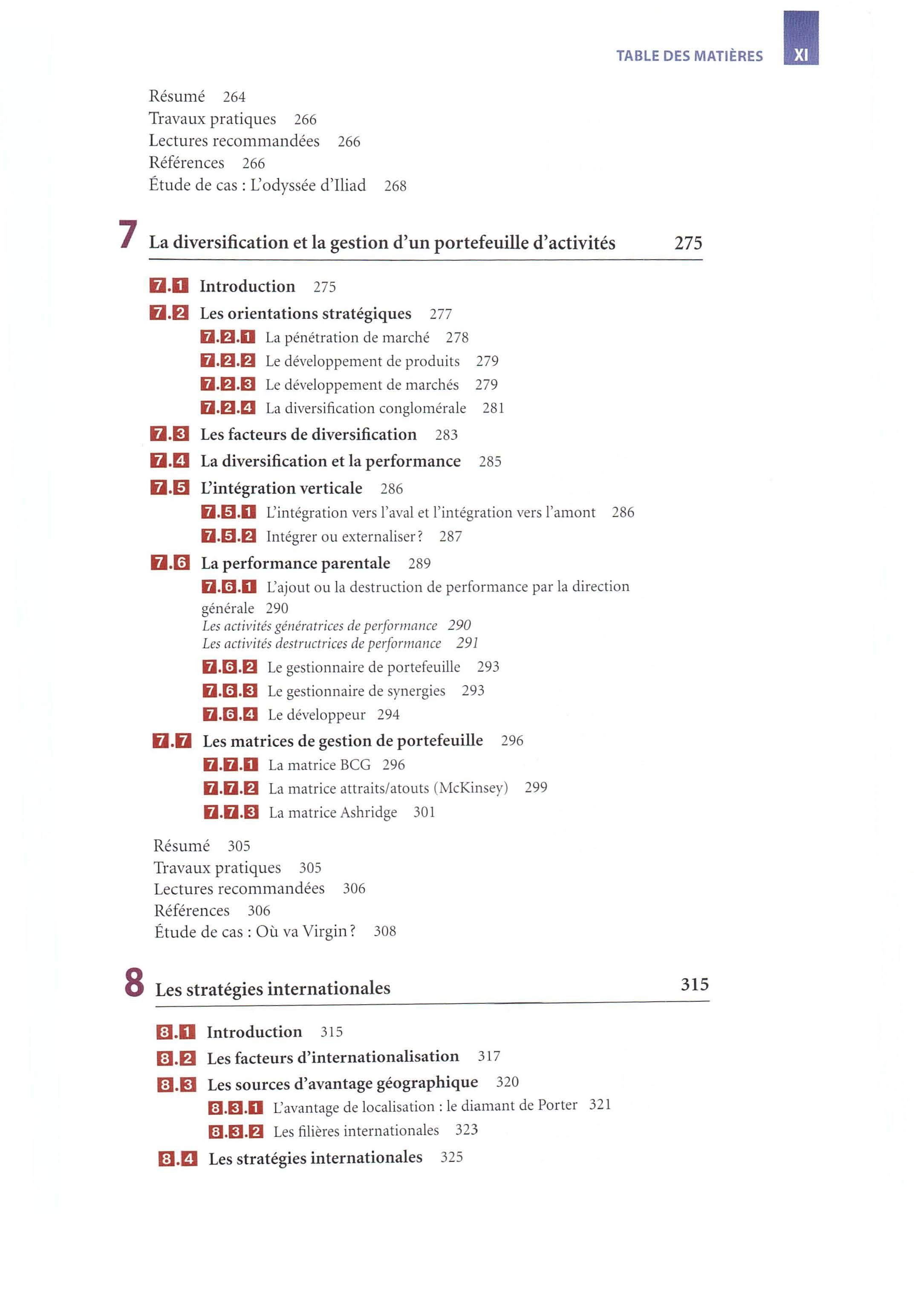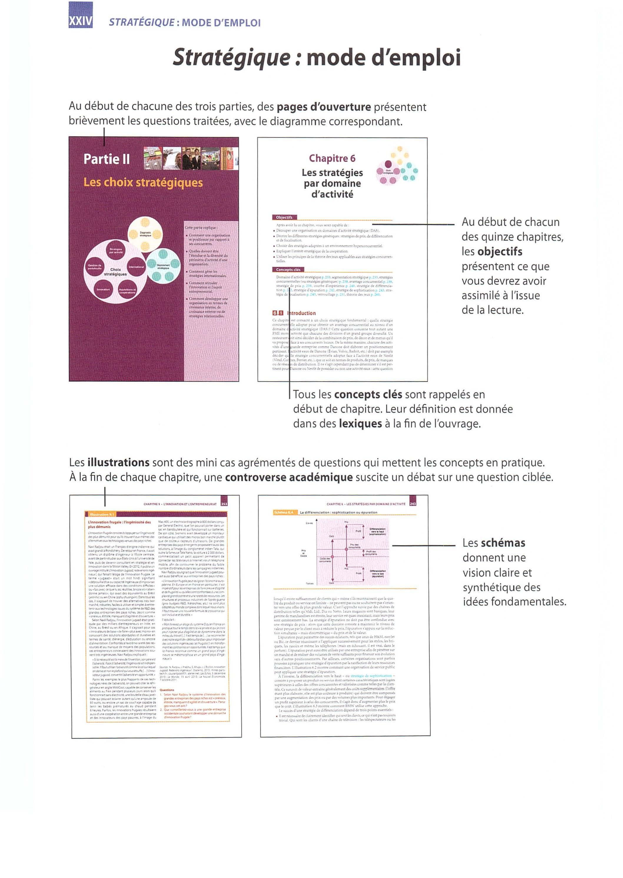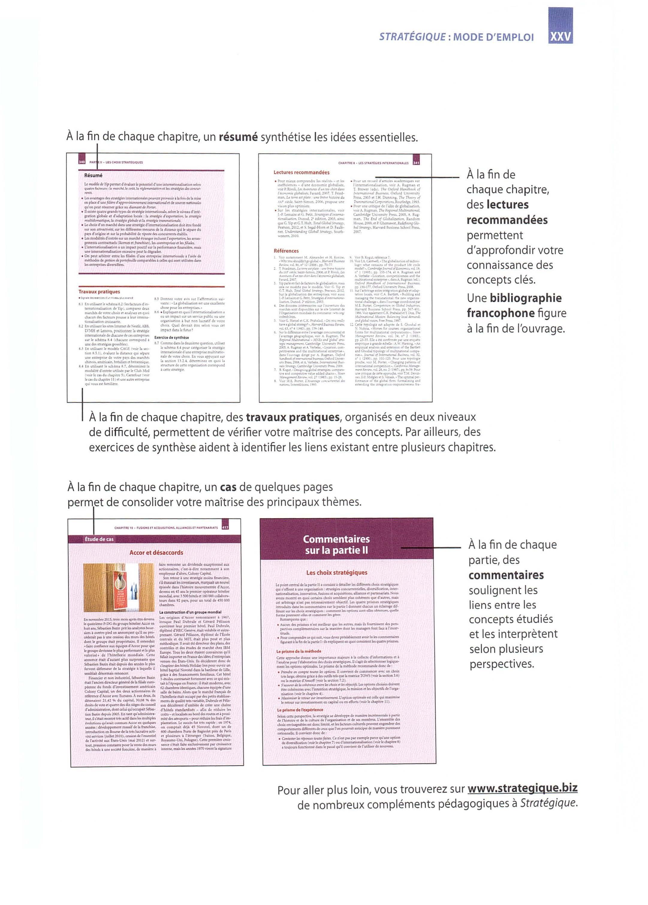 • Un véritab le outil pédagogique. Chaq u e chapitre comprend des objectifs, des illustrations agrémentées de questions, une controverse académique, un résumé, un e bibli ographie détaillée, des lectures complémentaires, une série de travaux pratiques et un cas de quelques pages. Tous les concepts clés sont soulignés dans le texte et leur définition rappelée en annexe . Les schémas sont nombreux et commentés. De plus, le lecteur pourra trouver des ressources complémentaires (g lo ssaire, cas et illu strations supplémentaires, bibliographie étendue, etc. ) sur le site compagnon de l'ouvrage: www strateg iqu e.biz.