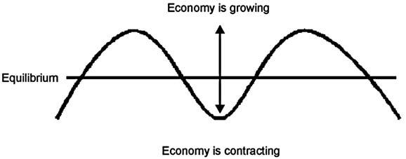 An economy is rarely stable; generally, it is either expanding or contracting. As a result, financial markets are in a continual state of flux. A hypothetical economy, as shown in Figure 2.1, revolves around a point of balance known as equilibrium. Roughly speaking, equilibrium can be thought of as a period of zero growth in which business activity is neither expanding nor contracting. In practice, this state of affairs is rarely, if ever, attained, since an economy as a whole possesses tremendous momentum in either the expansionary or the contractionary phase, so that the turnaround rarely occurs at an equilibrium level. In any event, the “economy” consists of a host of individual sectors, many of which are operating in different directions at the same time. Thus, at the beginning of the business cycle, leading economic indicators, such as housing starts, might be rising, while lagging indicators, such as capital spending, could be falling.