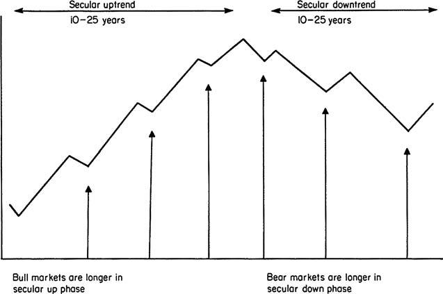 The primary trend consists of several intermediate cycles, but the secular, or very long-term, trend is constructed from a number of primary trends. This “super cycle,” or long wave, extends over a substantially greater period, usually lasting well over 10 years, and often as long as 25 years, though most average between 15 and 20 years. It is discussed at great length in Chapter 23. A diagram of the interrelationship between a secular and a primary trend is shown in Figure 1.2. It is certainly very helpful to understand the direction of the secular trend. Just as the primary trend influences the magnitude of the