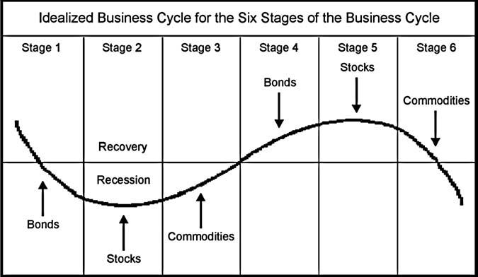 Figure 2.3 shows the hypothetical trajectories of bond prices, commodities, and equities during the course of a typical business cycle.