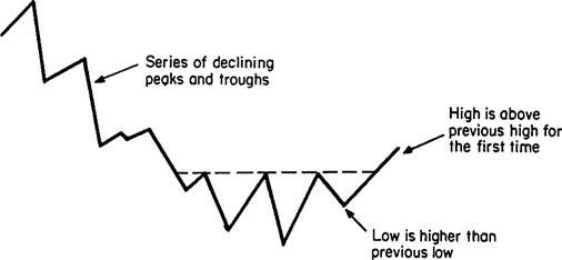 For example, if it takes 2 to 3 weeks to complete each wave in a series of rallies and reactions, the trend reversal will be an intermediate one, since intermediate price movements consist of a series of short-term (2- to 6-week) fluctuations. Similarly, the interruption of a series of falling intermediate peaks and troughs by a rising one signals a reversal from a primary bear to a primary bull market.
