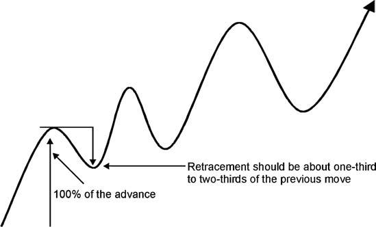 6. As a general rule, in order to qualify as a new legitimate peak or trough, the price should retrace between one-third and two-thirds of the previous move.