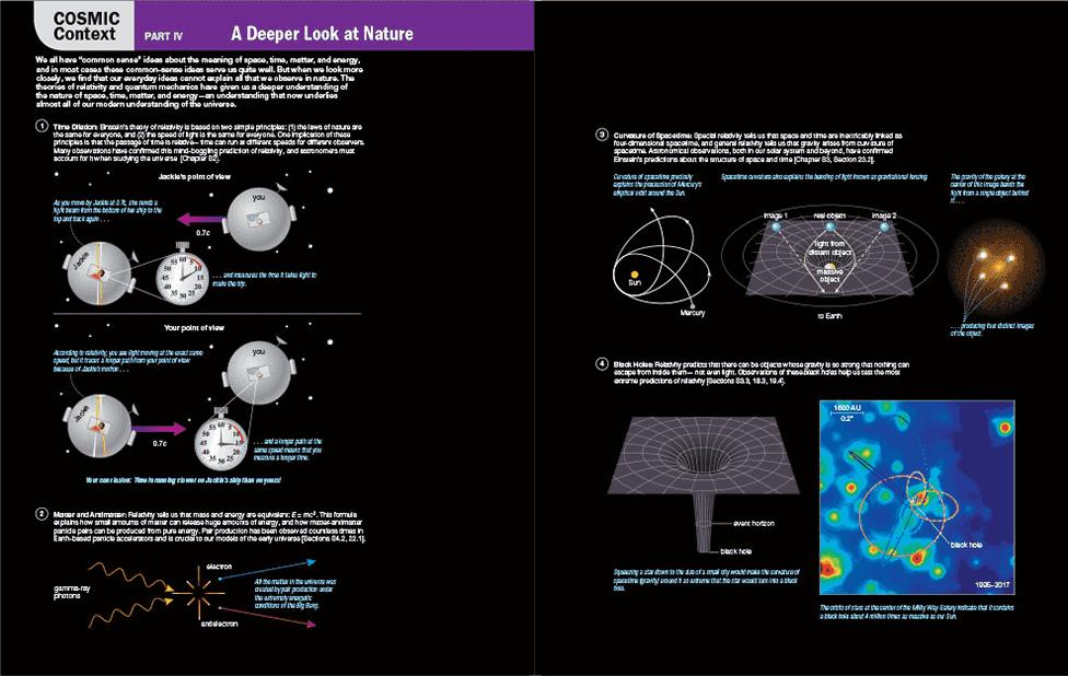 Nearlyallstudentshaveatleastheardofthingsliketheprohibitionon faster-than-lighttravel,curvatureofspacetime,andtheuncertainty principle.Butfew(ifany)studentsenteranintroductoryastronomy coursewithanyideaofwhatthesethingsmean,andtheyarenaturally curiousaboutthem.Moreover,abasicunderstandingoftheideasof relativityandquantummechanicsmakesitpossibletogainamuch deeperappreciationofmanyofthemostimportantandinterestingtopics inmodernastronomy,includingblackholes,gravitationallensing,and theoverallgeometryoftheuniverse.Thethreechaptersof Part IV coverspecialrelativity(Chapter S2 ),generalrelativity(Chapter S3 ),