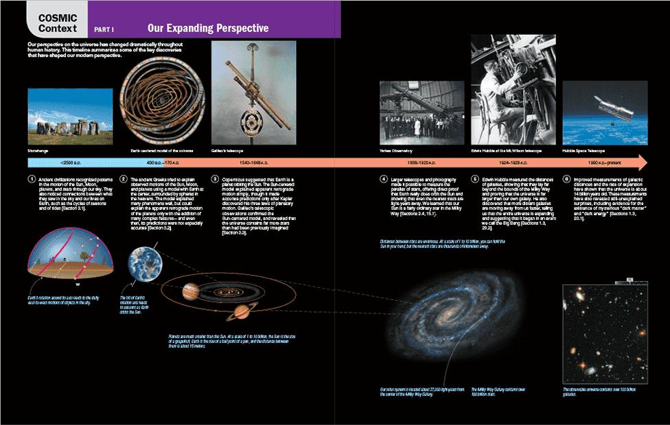 TheCosmicContext figurefor Part I appearson pp. 108-109. Thebasicgoalofthesechaptersistogivestudentsabig-pictureoverview andcontextfortherestofthebook,aswellastohelpthemdevelopan appreciationfortheprocessofscienceandhowsciencehasdeveloped throughhistory. Chapter 1 outlinesourmodernunderstandingofthe cosmos,includingthescaleofspaceandtime,sothatstudentsgain perspectiveontheentireuniversebeforedivingintoitsdetails. Chapter 2 introducesbasicskyphenomena,includingseasonsandphasesofthe Moon,andprovidesperspectiveonhowphenomenaweexperienceevery dayaretiedtothebroadercosmos. Chapter 3 discussesthenatureof science,offeringahistoricalperspectiveonthedevelopmentofscience andgivingstudentsperspectiveonhowscienceworksandhowitdiffers fromnonscience.Thesupplementary(optional) Chapter S1 goesinto moredetailaboutthesky,includingcelestialtimekeepingandnavigation.