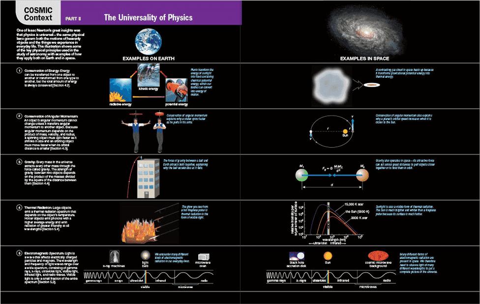TheCosmicContext figurefor Part II appearson pp. 188-189. Thesechapterslaythegroundworkforunderstandingastronomythrough whatissometimescalledthe“universalityofphysics”—theideathatafew keyprinciplesgoverningmatter,energy,light,andmotionexplainboth thephenomenaofourdailylivesandthemysteriesofthecosmos.Each chapterbeginswithasectiononscienceineverydaylifeinwhichwe remindstudentshowmuchtheyalreadyknowaboutscientific phenomenafromtheireverydayexperiences.Wethenbuildonthis everydayknowledgetohelpstudentslearntheformalprinciplesof physicsneededfortherestoftheirstudyofastronomy. Chapter 4 coversthelawsofmotion,thecrucialconservationlawsofangular momentumandenergy,andtheuniversallawofgravitation. Chapter 5 dealswiththenatureoflightandmatter,theformationofspectra,and theDopplereffect. Chapter 6 coverstelescopesandastronomical observingtechniques.