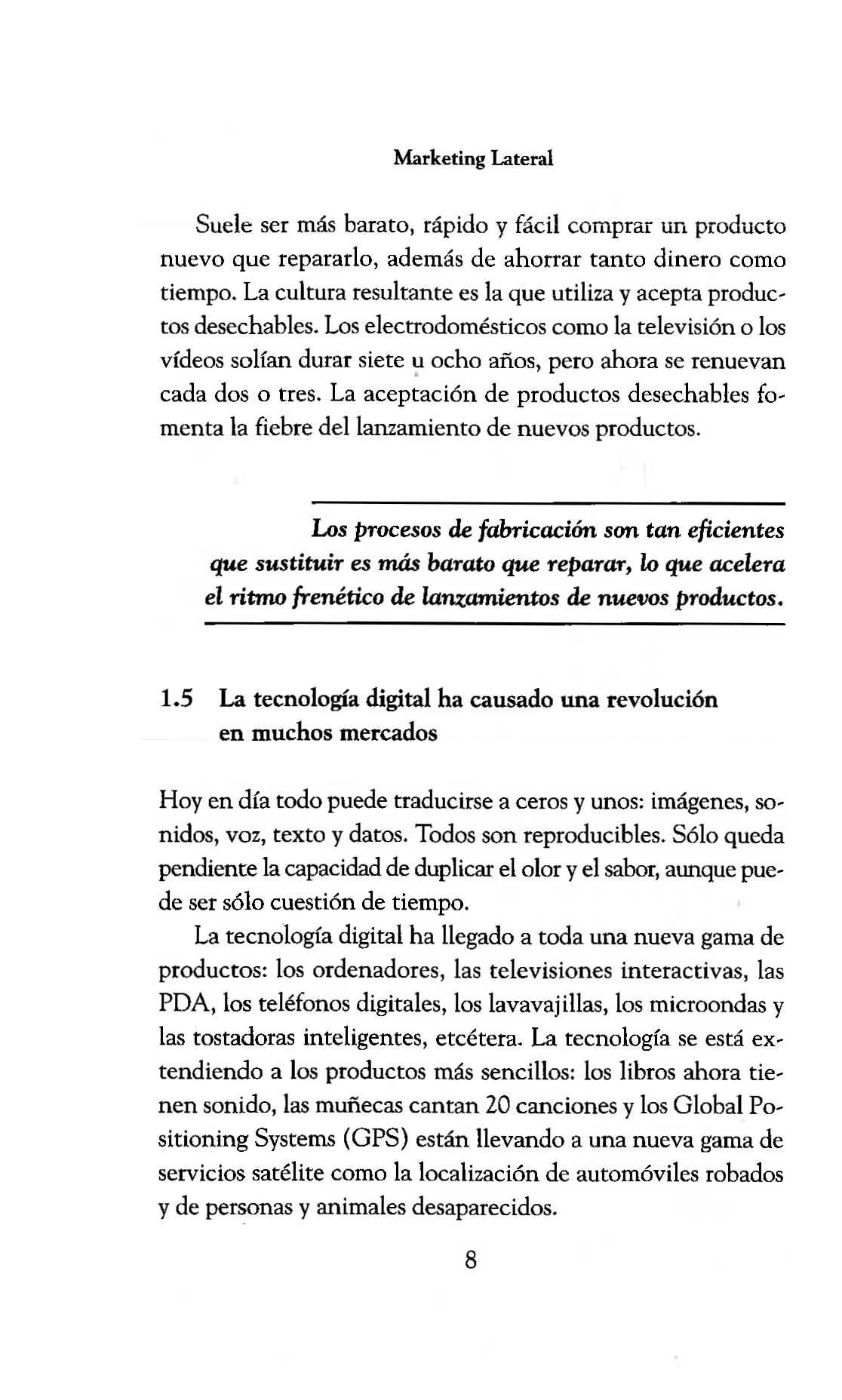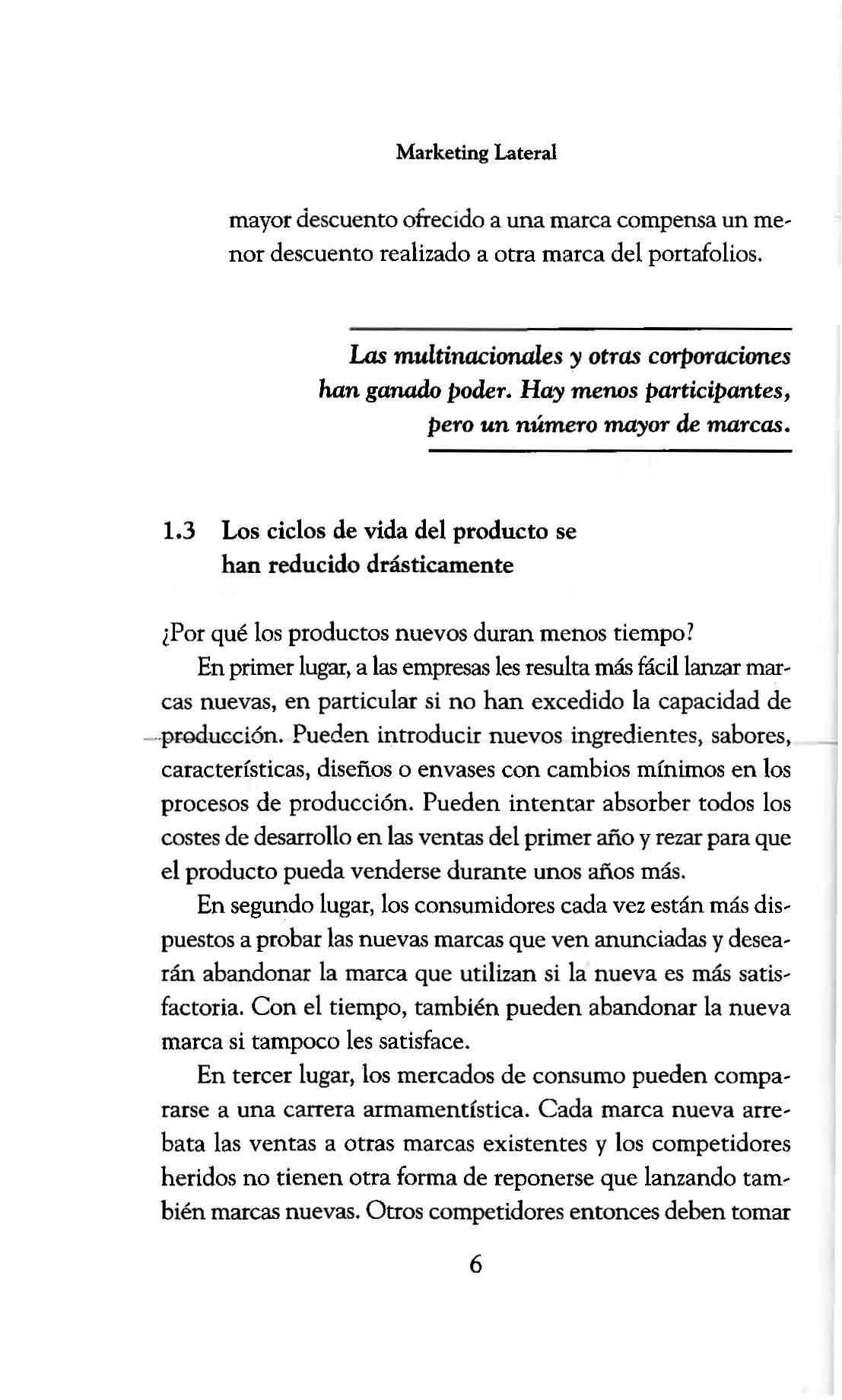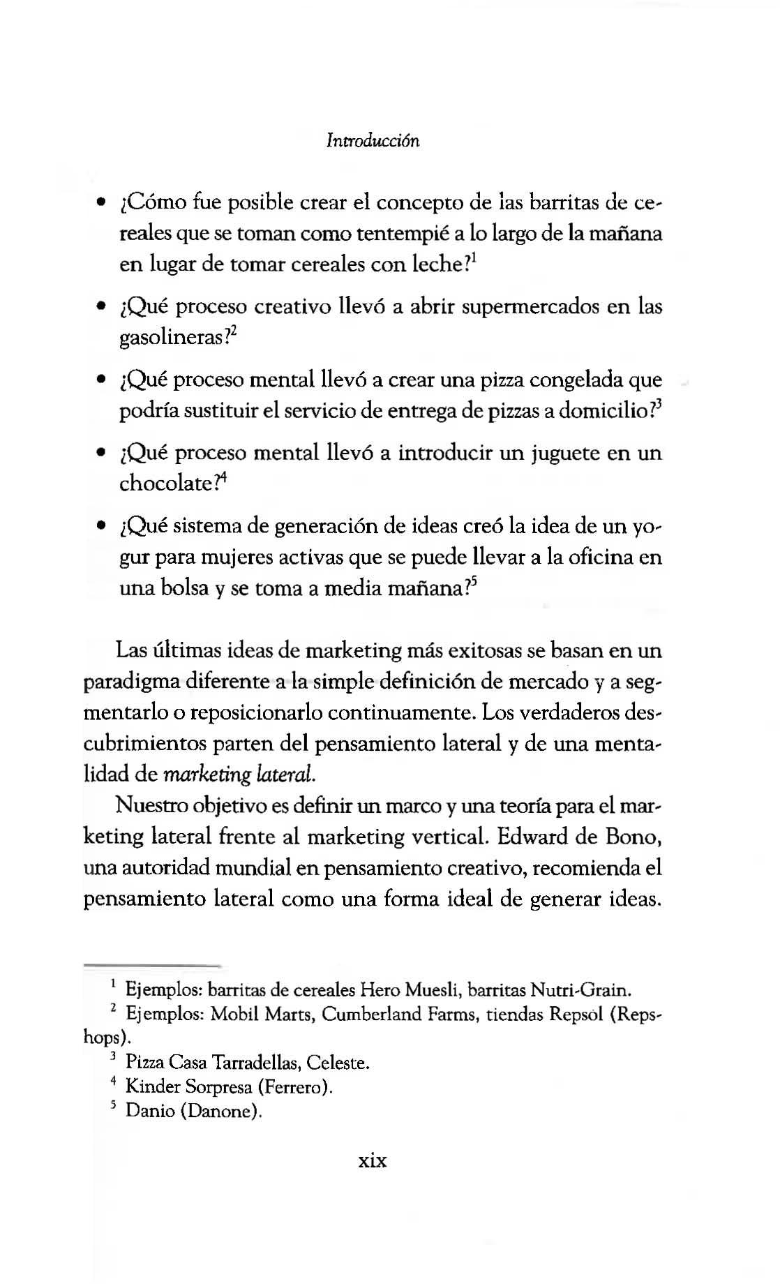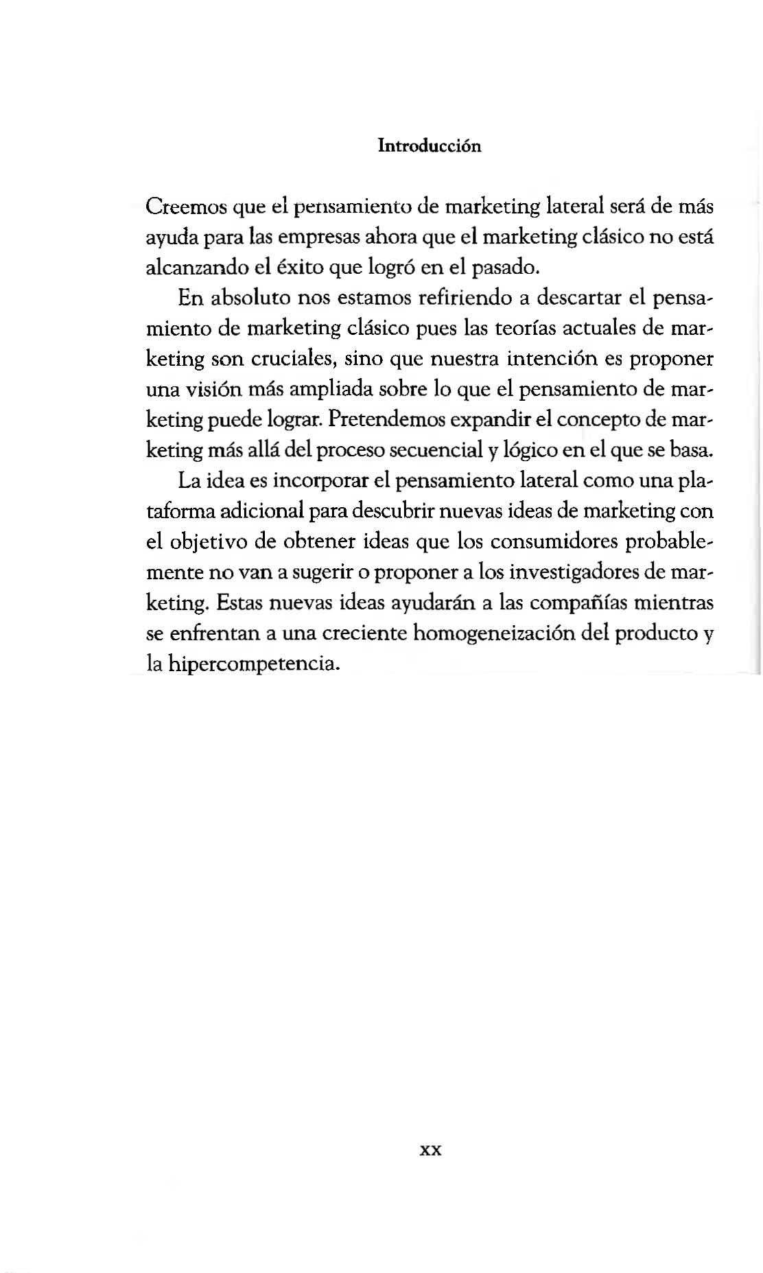 En absoluto nos estamo s refiriendo a descart ar el pensamiento de marketing clásico pues las teorías actuales de marketing son cruciales, sino que nuestra intención es proponer una visión más ampliada sobre 10 que el pensamiento de marketing puede lograr. Pretendemos expandir el concepto de marketing más aJlá del proceso secuencial y lógico en el que se basa. La idea es incorporar el pensamiento lateral como una plataforma adicional para descubrir nuevas ideas de marketing con el objetivo de obtener ideas que los consumidores probablemente no van a sugerir o proponer a los investigad ores de marketing. Estas nuevas ideas ayudarán a las compañías mientras se enfrentan a una creciente homogeneización del producto y la hipercompetencia.