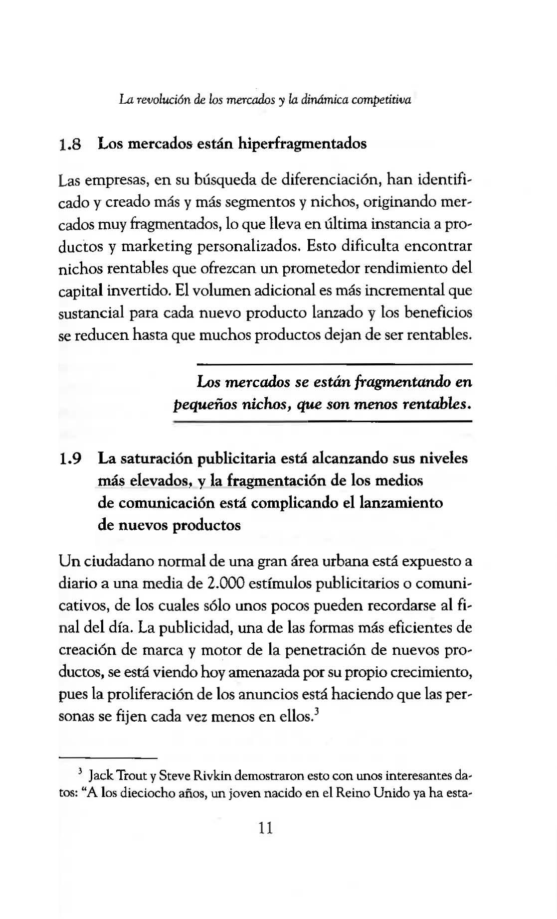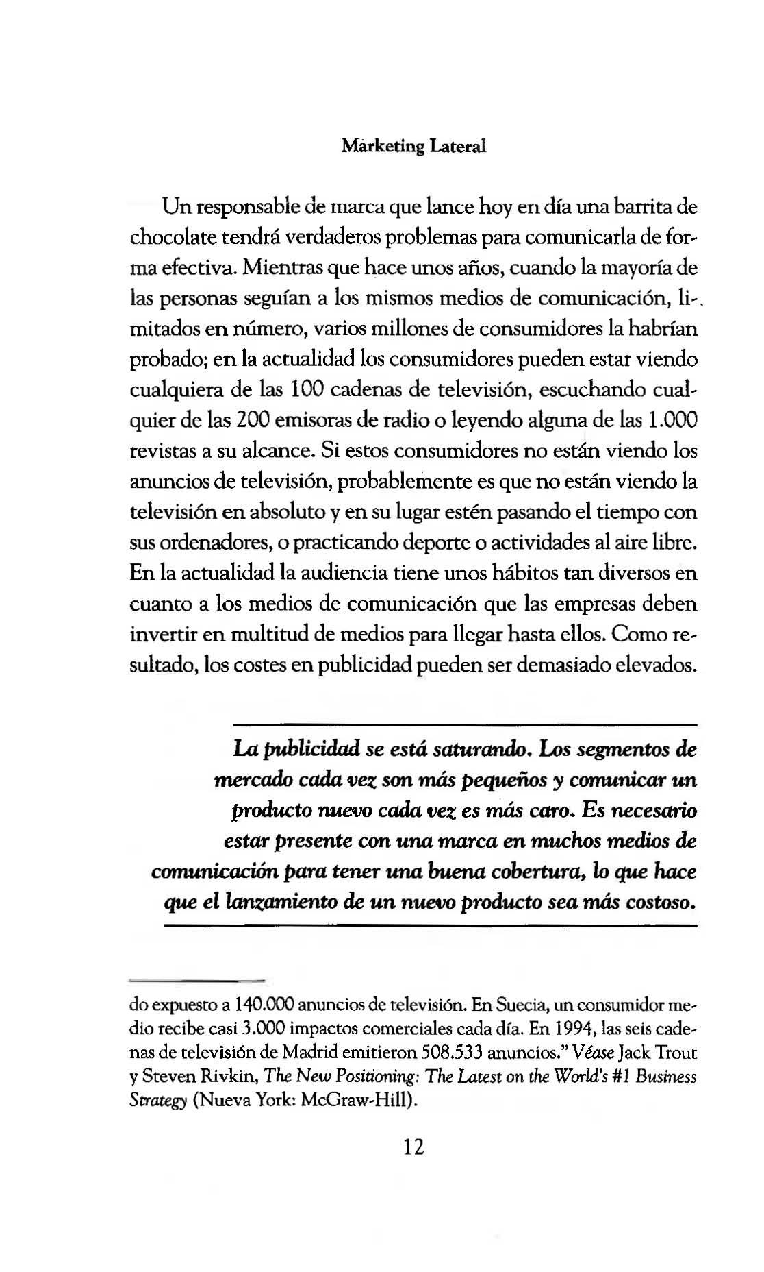 La publicidad se está saturando. Los segmentos de mercada cada Vet son más pequeños 'Y comunicar un producto nuevo cada vez es más caro. Es necesario estar presente con una marca en muchos medios de comunicación para tener una buena cobertura, lo que hace que e1lantamiento de un nuevo producto sea más costoso. do expuesto a 140.CXJO anuncios de televisión. En Suecia, un consumidor dio recibe casi 3.000 impactos comerciales cada dCa. En 1994, lasseis cadenas de televisión de Madrid emitieron 508.533 anuncios." Véase Jack Trout y Steven Rivkin, The New Posicioning: The LateS! on!he World's #1 Business StTatellJ (Nueva York: McGraw-Hill)