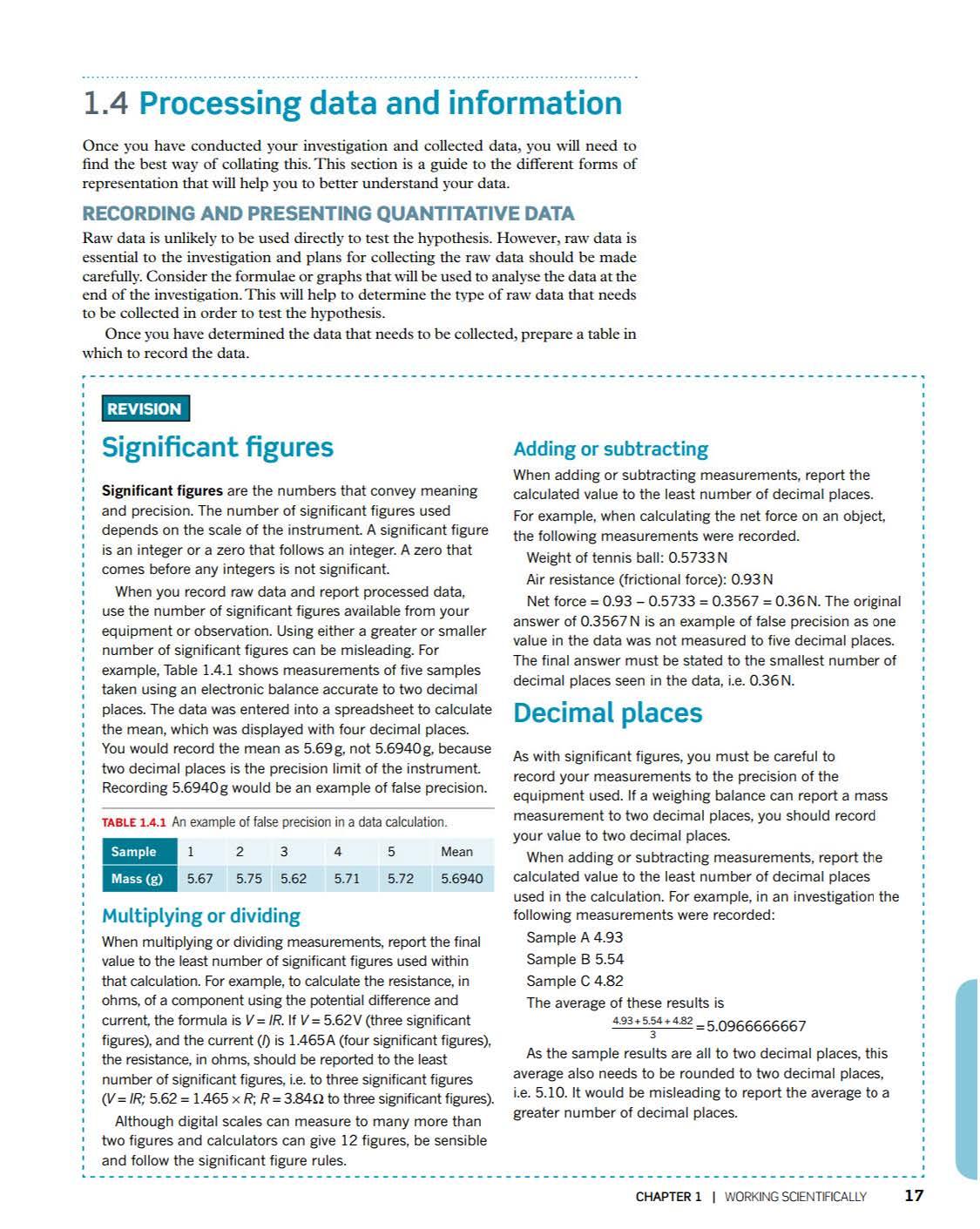 When you record raw data and report processed data, use the number of si gnificant figur es availabl e from your equipment or observati on. Using either a greater or smaller number of significant figures can be misleadi ng For example, Table 1.4.1 shows measurements of five samples taken using an electron ic bal ance accurate to two decimal places. The data was entered into a spreadsheet to calcu l ate the mean, wh ich was displayed wi th four decimal p l aces.
