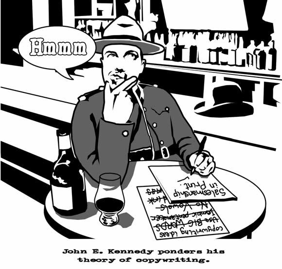 Inthelate1890saCanadianMountienamedJohnE.Kennedy hunguphishat,handedinhisgunanddidwhatanyrock-jawed lawenforcementoperativewoulddoinsimilarcircumstances–hegotintoadvertising.Notjustanyadvertising,mind.Kennedy wasconcernedwithcopy.Theadvertisingagenciesofhisday employedplentyofpeoplecalledcopywriters,buttheircraftwas farfromfullydefined.Kennedyhadthoughtlongandhard abouthowwordscouldbemadetoworkharder.Herealisedthe burgeoningadvertisingindustrywasmissingatrickandthathe wasthemantoputthingsright.Sothat’sexactlywhathesetout todo.