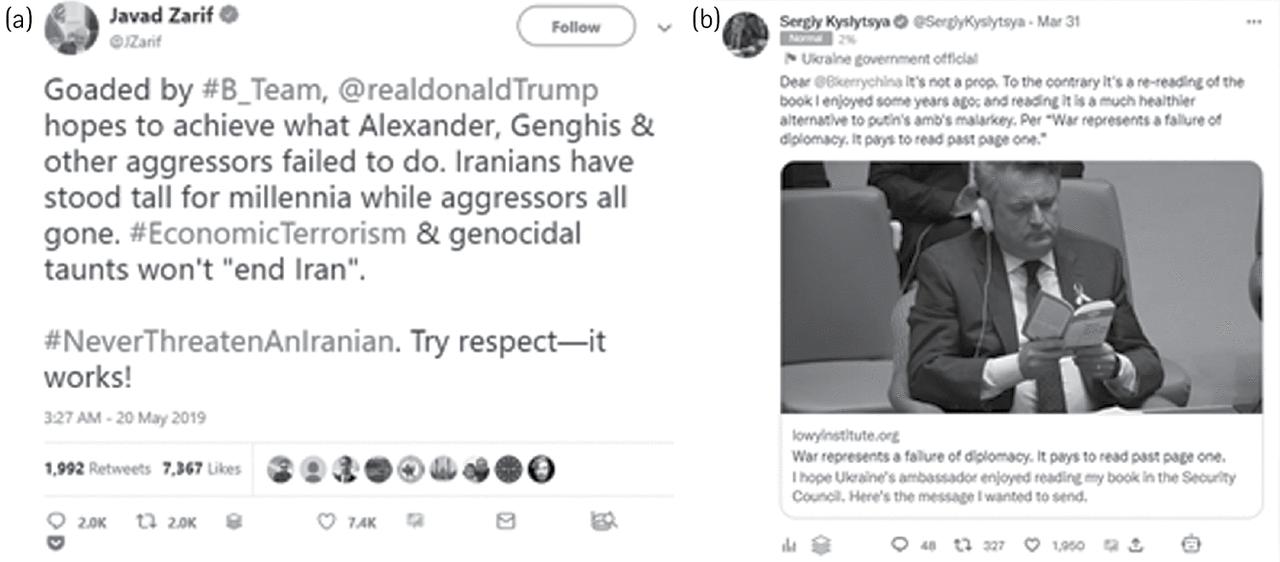 former Iranian Foreign Minister, Javad Zarif (see Figure 1.2a), and the Permanent Representative of Ukraine to the United Nations, Sergiy Kyslytsya (see Figure 1.2b), in two different situations. Mr Zarif was reacting to a statement made by the former US President Donald Trump threatening military action against Iran (Al Jazeera, 2019), while Ambassador Kyslytsya indirectly questioned the justification of allowing the Russian Permanent Representative to the UN to speak to the UN Security Council, amid Russia’s invasion of Ukraine (Charles, Ryder, and Earl, no dat e). Mr Zarif’s tweet (2019) conveyed a pugnacious expression of angry defiance, while Amb. Kyslytsya (2022) relied on sarcasm, as a contrast between a positive sentiment and a negative situation, to establish a connection with the viewer. Both messages enjoyed high levels of reception by the audience (several times the average of RTs and Likes normally received by the two diplomats) largely due to their effective emotional framing.