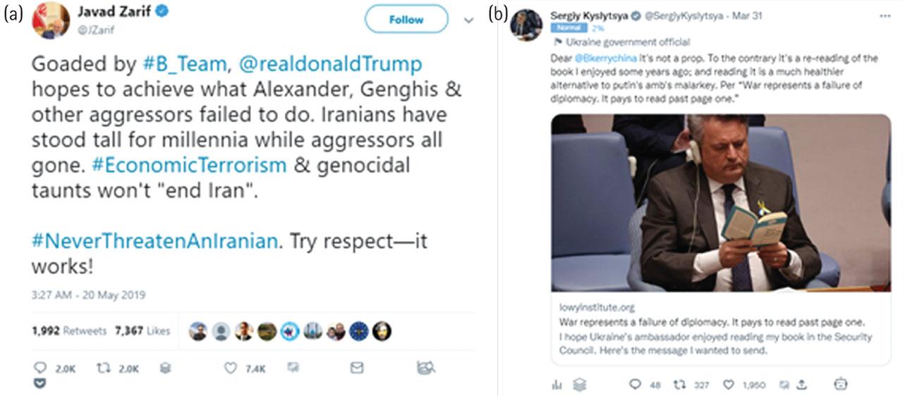 Source: Zarif, J. (2019). Available at: https://twitter.com/JZarif/status/1130419673756049410 (accessed 28 January 2023); Kyslytsya, S. (2022). Available at: https://twitter.com/SergiyKyslytsya/ status/1509560144757207044 (accessed 28 January 2023).