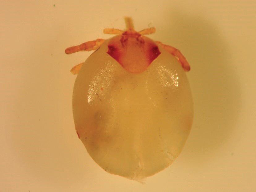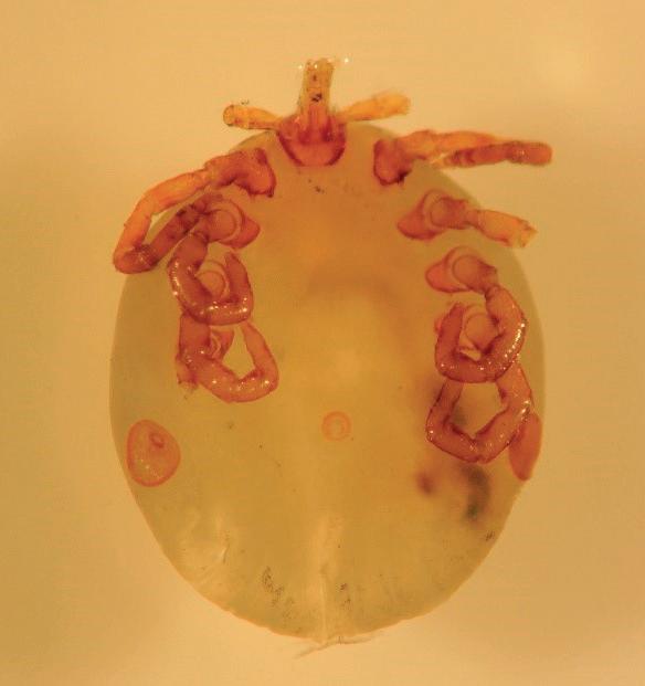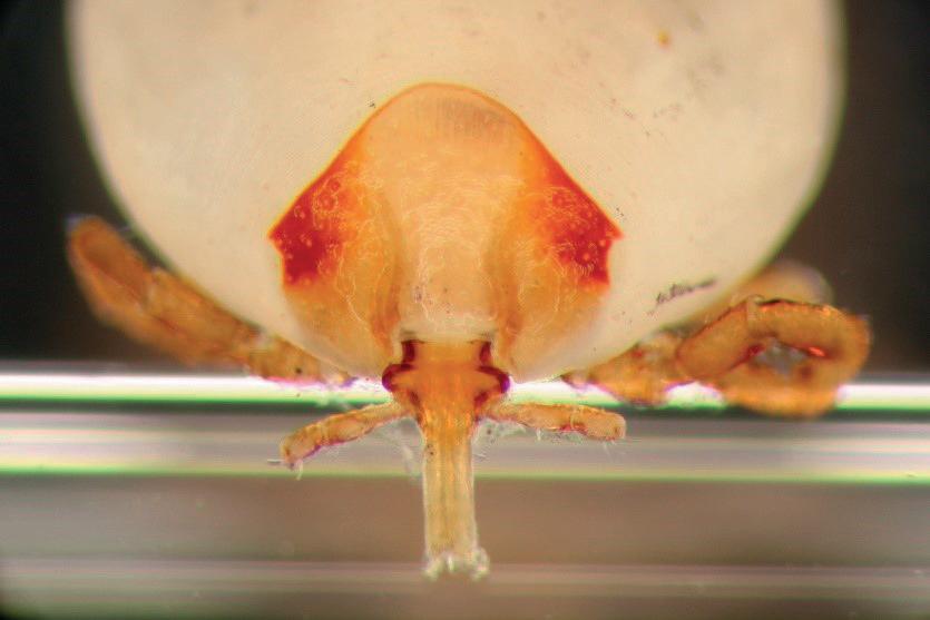hadbeeninatropicalforestinKibale,Uganda, studyinghowanthropogenicchangestoecosystemsalterhealth-relatedoutcomesandinfectious diseasedynamicsinpeople,wildlife,anddomestic animals.NowbackathisWisconsinhome,Goldbergusedanangledmirrortoexaminehisnostril, andconfirmedhissuspicionsbyseeingthe‘smooth, roundedbacksideofafullyengorgedtick’.While rare,these‘nostrilticks’arenotunheardofinvisitorstoKibaleNationalPark.ThiswasDrGoldberg’s thirdinfestation(andyethekeptreturning!).Fortunately,hesufferednolastingharm,besidesthe mentaltraumaofhavingablood-suckingarachnid insidehisnose.