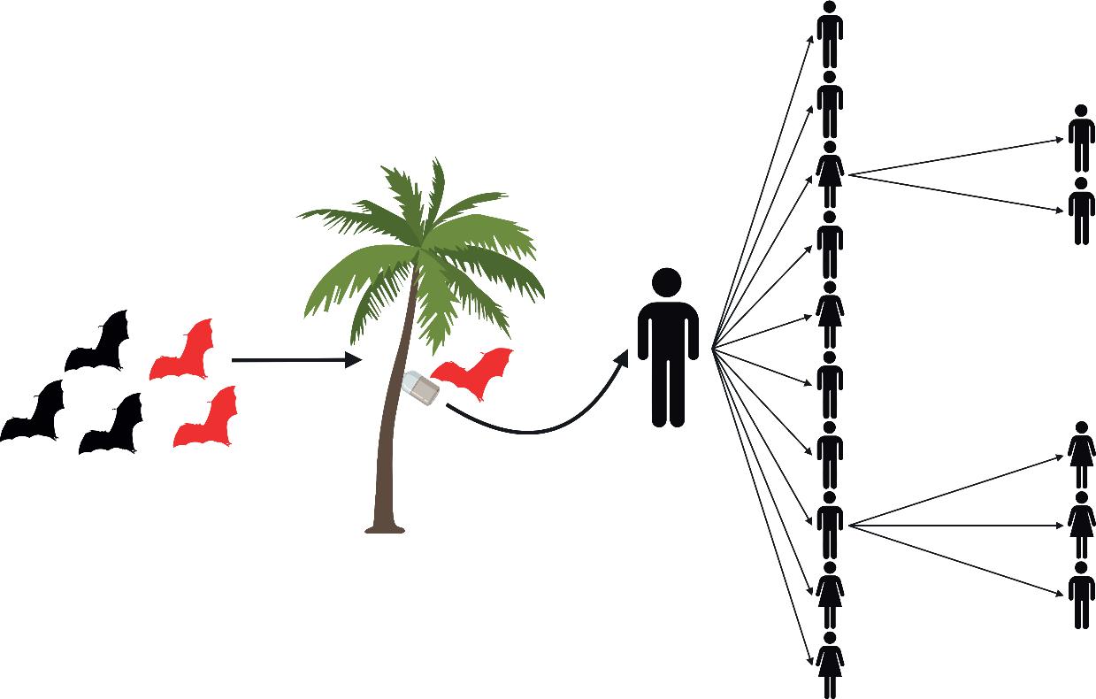 Stutteringzoonoses canjumpfromanimalsinto humans,andthen,withsomelimitedsuccess,into otherpeople.Intheseoutbreaks, human-to-human transmissionislimitedandthepathogen stutters or fadesout beforeafull-blownepidemicoccurs. Forexample,since2001,inBangladesh,therehave beenrecurrentspilloversofNipahvirustohumans fromIndianfruitbats(Pteropusmedius).Often,the spilloverresultsinanisolatedhumancase,but human-to-humantransmissioncaninfectamean of7persons(range1–22)resultinginastuttering outbreak(Lubyetal.2009)(Fig. 1.4).Inanother examplefromSouthTexas,USA,therearesuitablemosquitovectorsforZikavirus,butZikaoutbreaksinhumanshavetendedtofadeout,perhaps becausethemosquitoesarepredominantlybiting non-humanhosts(dogs,domesticanimals)(Olson etal.2020).