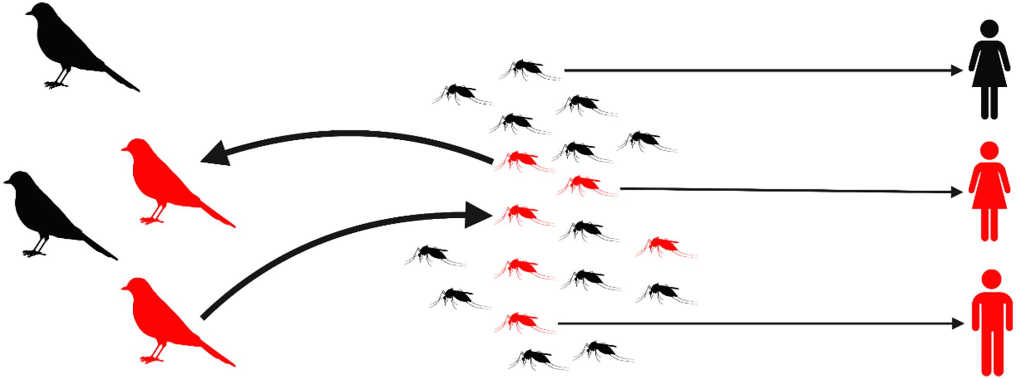 Figure1.3 WestNilevirusistransmittedamongwildbirdsbymosquitoesintheUnitedStates.Infected(red)mosquitoesthatfeedonhumans maycauseazoonoticspilloverbyinfectingpeople(red),butthereisnofurthertransmissionfromperson-to-person;itisadead-endzoonosis.