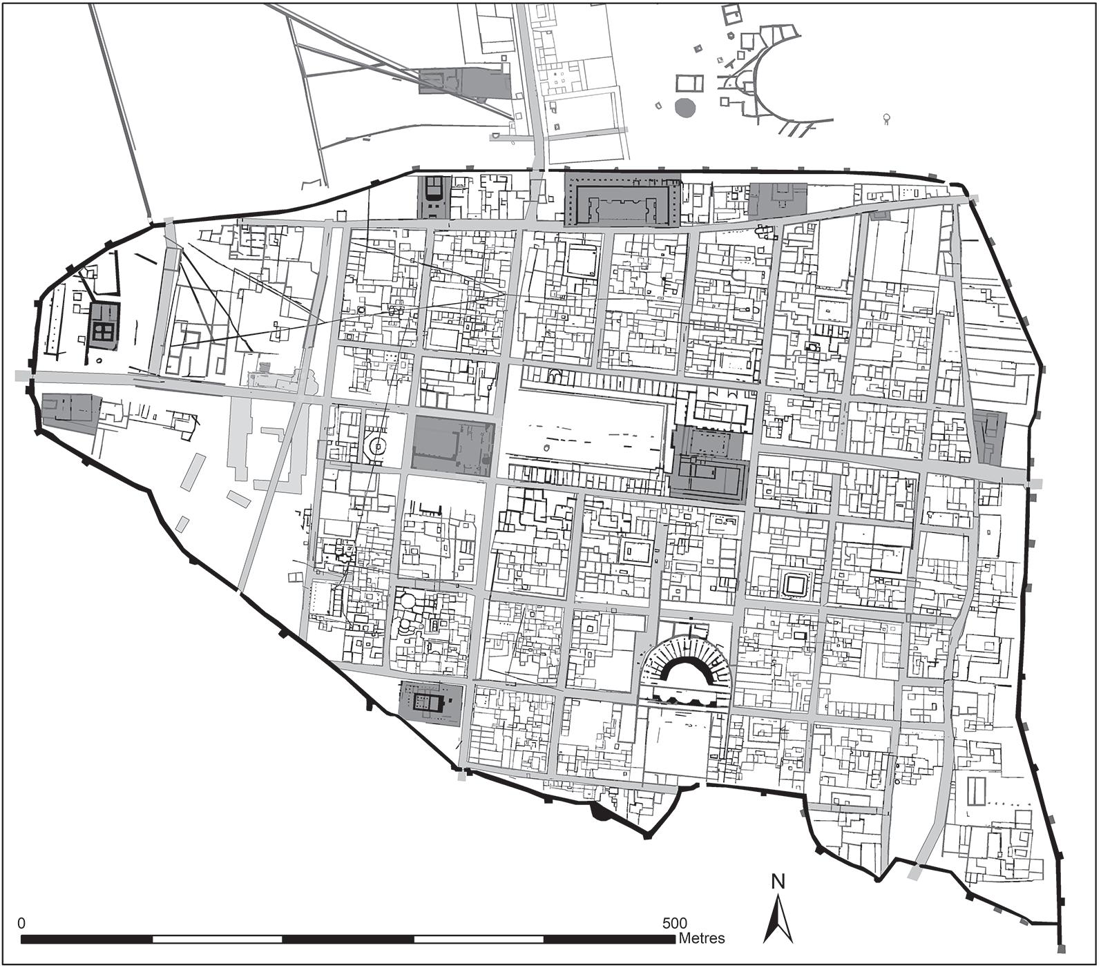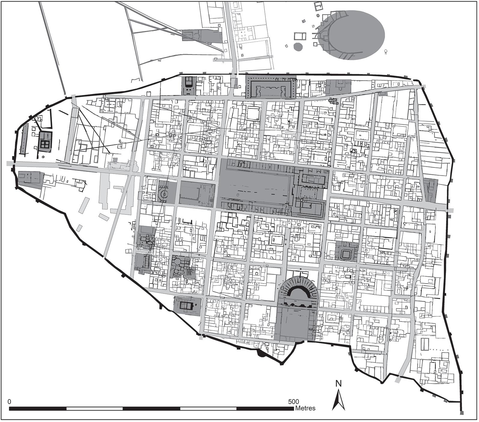 Survey evidence is especially important for seeing overall patterns in the use of space across the whole townscape, and with the results of the GPR survey we have been able to identify a wide range of public buildings, even though the interpretation of some remains uncertain (Fig. 2.4). The principal public building and facilities identified (in addition to the temples discussed below) are the forum and basilica, two suites of baths, the theatre, the amphitheatre, two macella, a nymphaeum and the aqueduct.