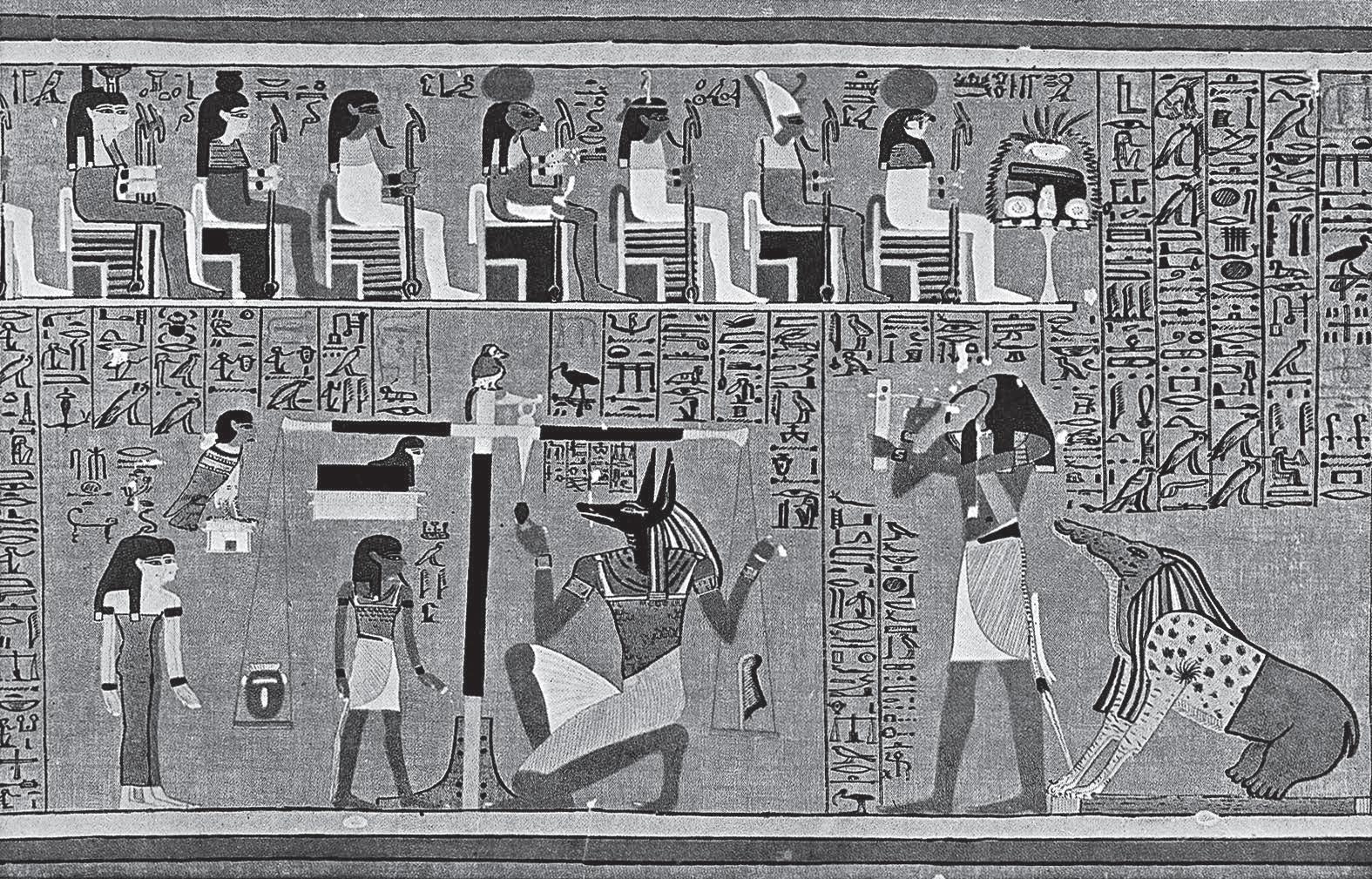 FIGURE 1.4 Weighing of the heart, the Egyptian Book of the Dead, Papyrus of Ani (19th Dynasty, c. 1250 bce). Edited by A. Mayer in 1925. CC BY 4.0 (https://creativecommons.org/licenses/by/4.0/deed.en)
